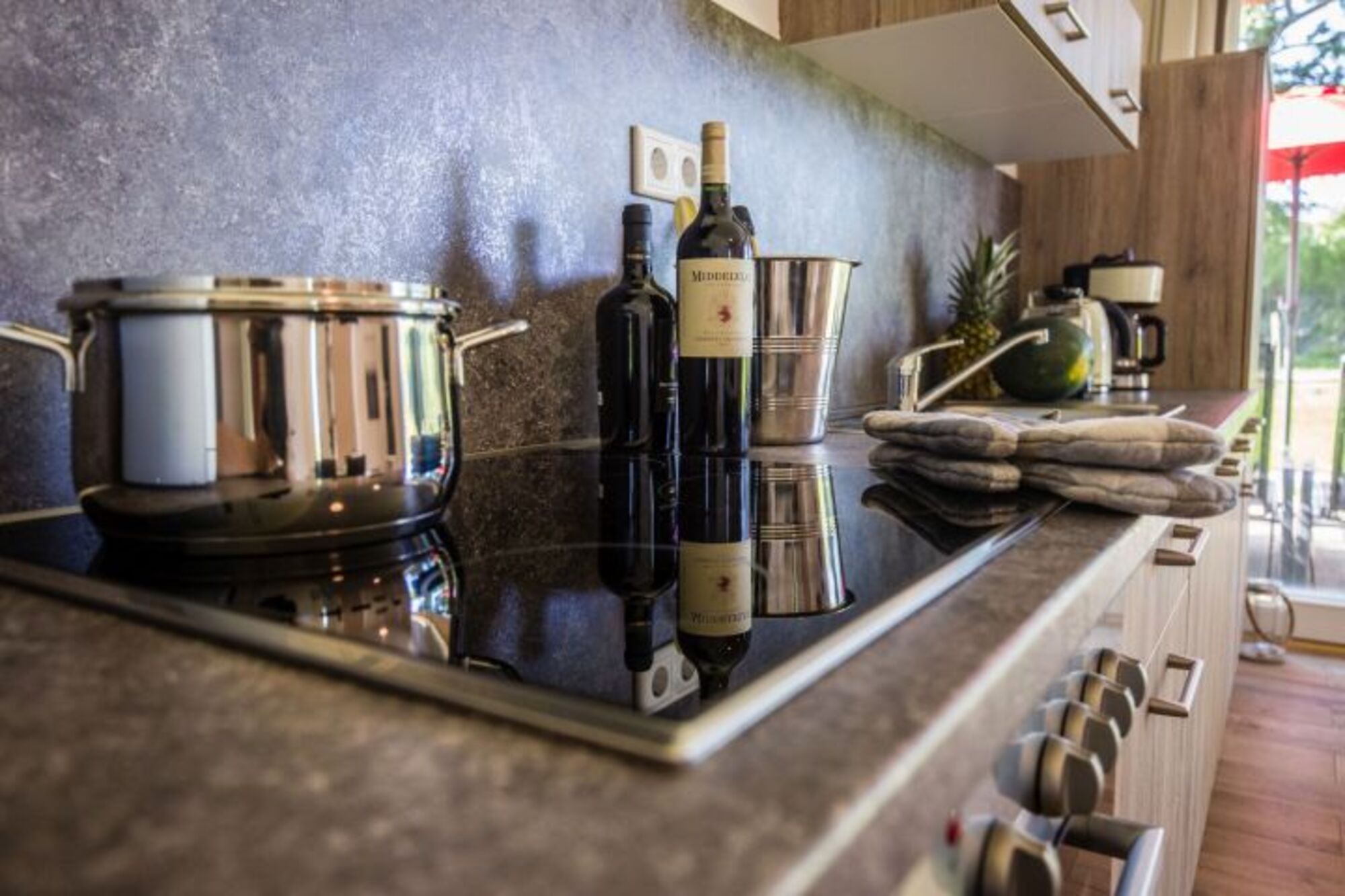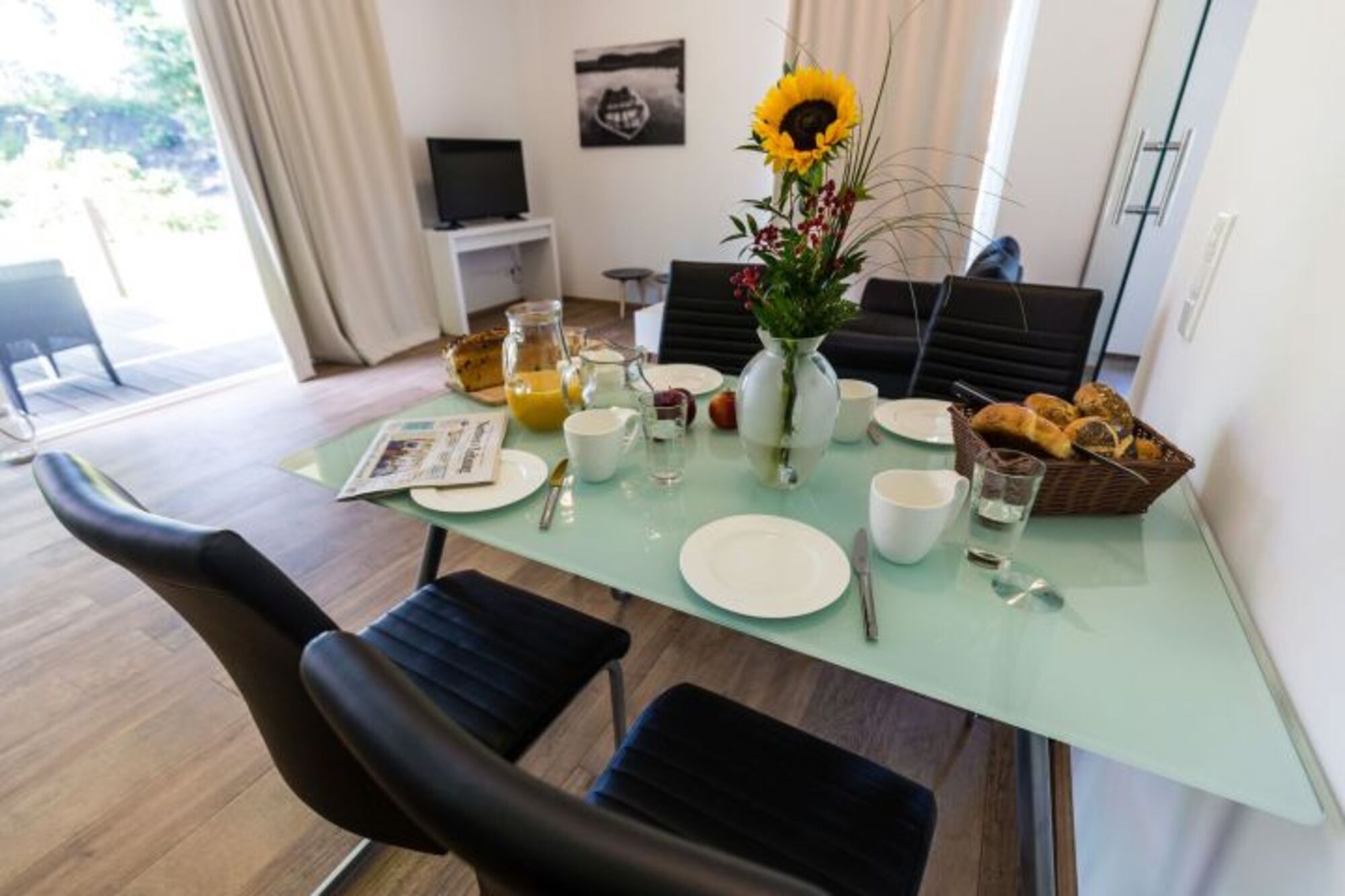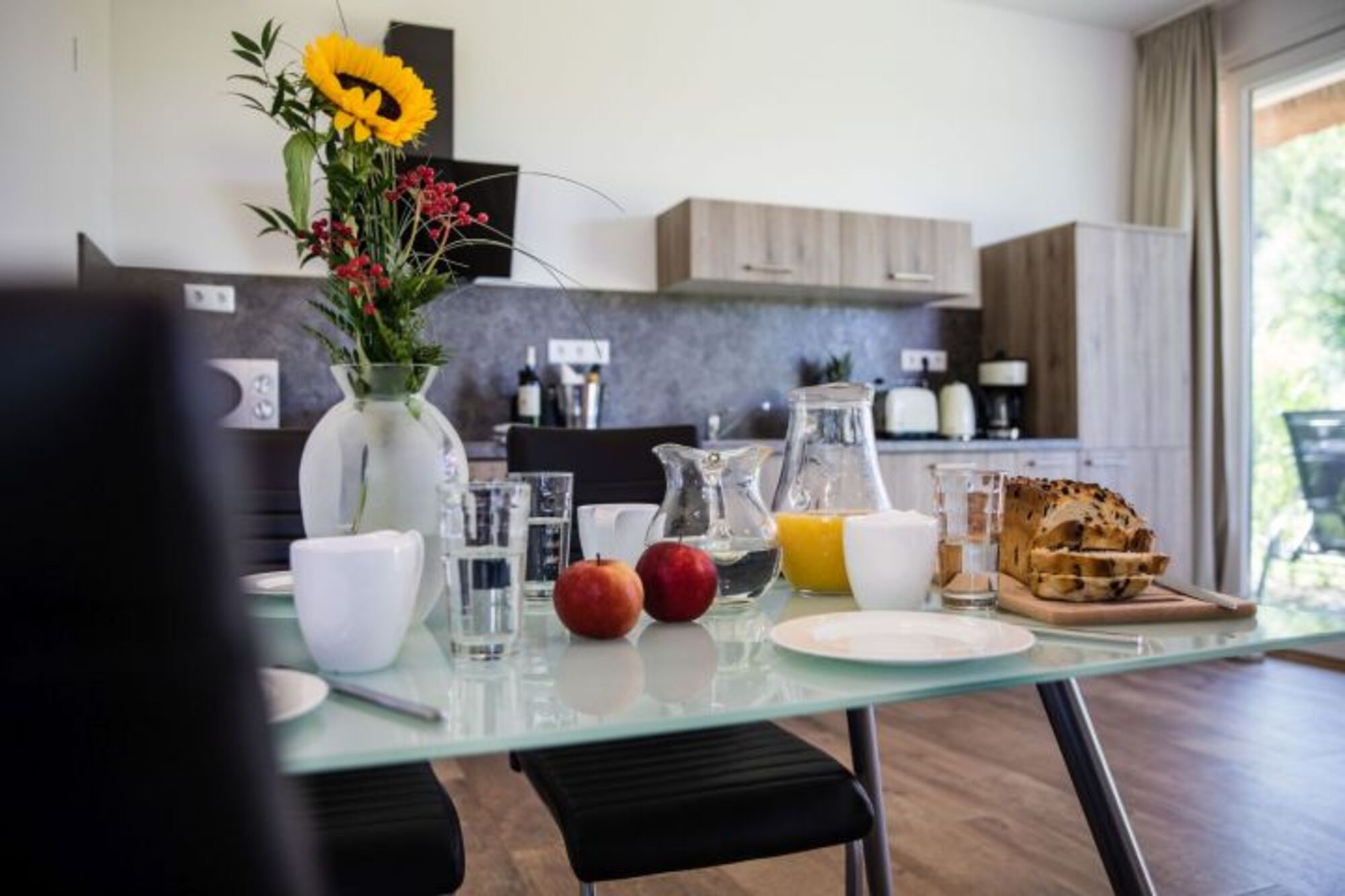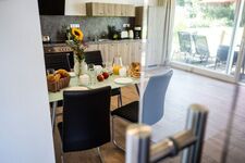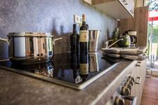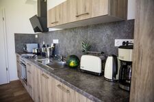 Cerankochfeld, Dunstabzugshaube, Kühlschrank mit Gefrierfach, Eierkocher, Küchenmaschine, Mixer, Korkenzieher / Flaschenöffner, Geschirrhandtücher, Mülltüten, Essplatz in der Küche, TV in der Küche
