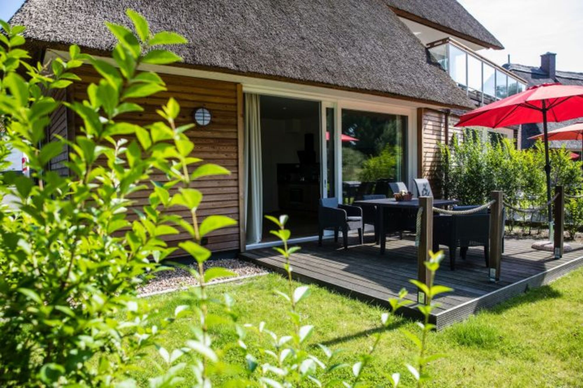 Vom lichtdurchfluteten Wohnbereich gelangen Sie direkt auf die mit Liegen und Sitzmöbeln ausgestattete Terrasse. Auch ein Grill ist vorhanden. Von hier haben Sie einen wunderschönen Blick auf den Naturbadesee der im Sommer oder nach einem Saunagang zum Baden einlädt.