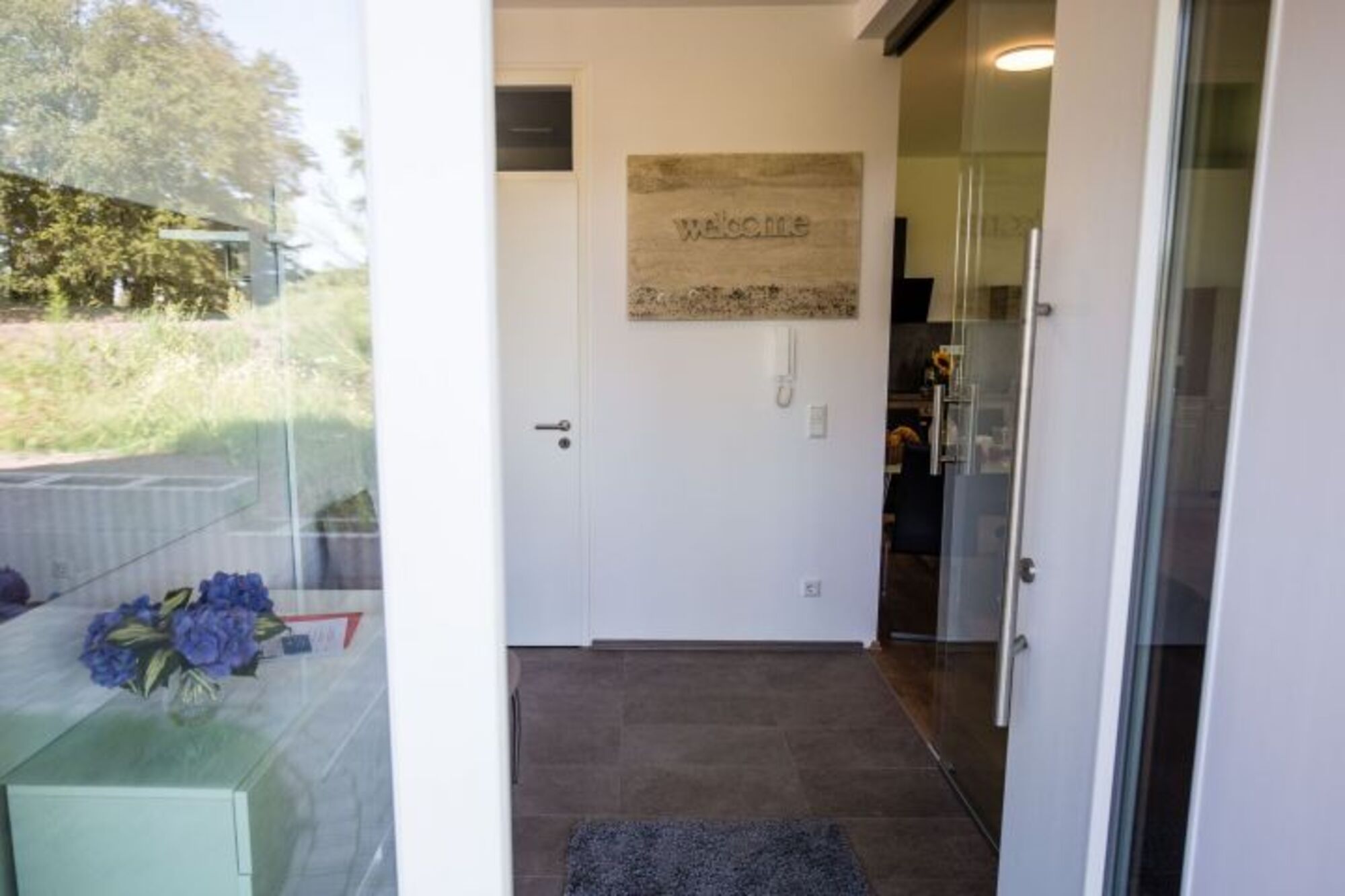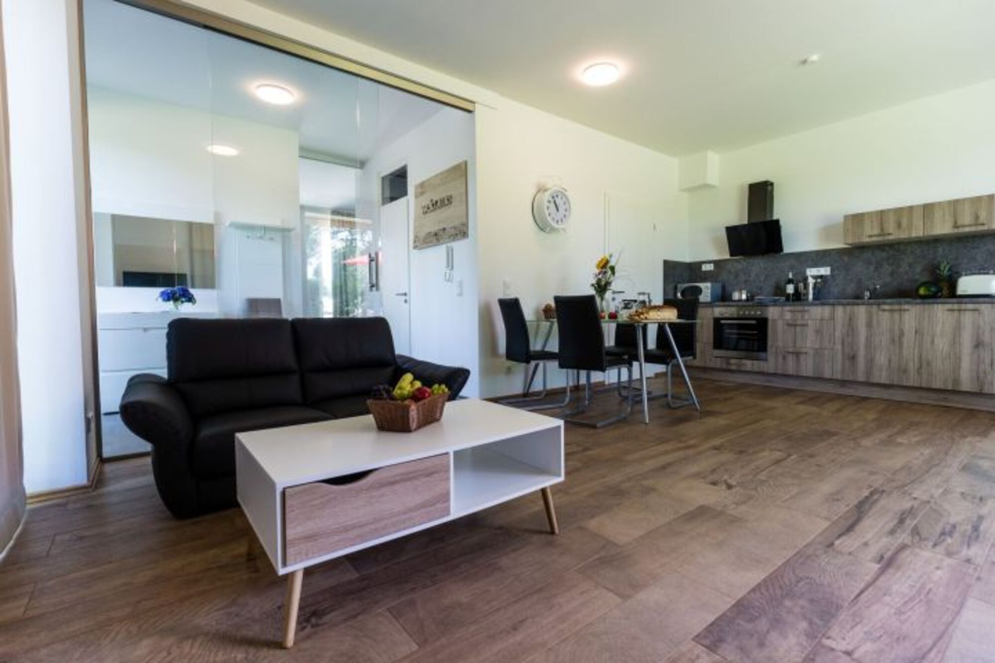 Durch den Eingangsbereich mit Garderobe gelangen Sie in das lichtdurchflutete Wohnzimmer mit offener Küche und Essbereich. Genießen Sie erholsame Nächte in einem Schlafzimmer mit Boxspringbett und direktem Zugang zum Duschbad, welches sehr charmant in das Schlafzimmer integriert wurde.