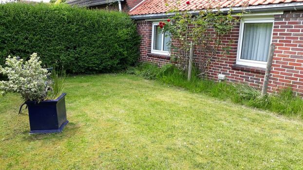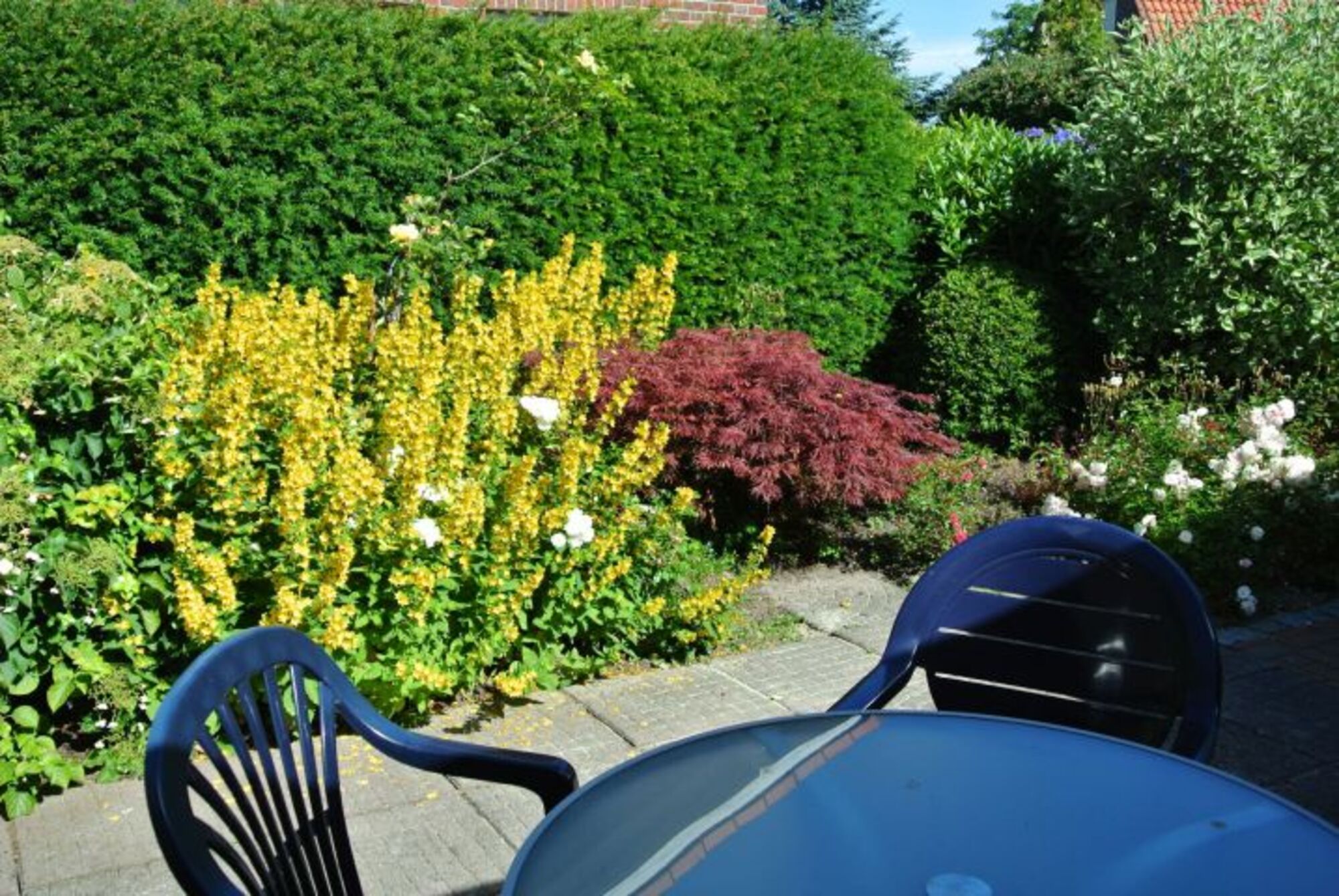 Ein kleiner windgeschützter Garten mit Terrasse hinter dem Haus kann direkt vom Esszimmer erreicht werden. Vor dem Haus befindet sich noch ein von Hecken umgebener Garten mit Sonnenliegen.