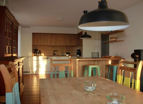 Das Feriendomizil hat eine Größe von ca. 75 qm und eine freundliche Einrichtung im Landhausstil. WLAN ist vorhanden. Durch ihre tolle Ausstattung überzeugt die offene Küche. Ein Kaminofen steht im Wohnbereich begeistert mit Wärme und die dadurch entstehende Gemütlichkeit.
