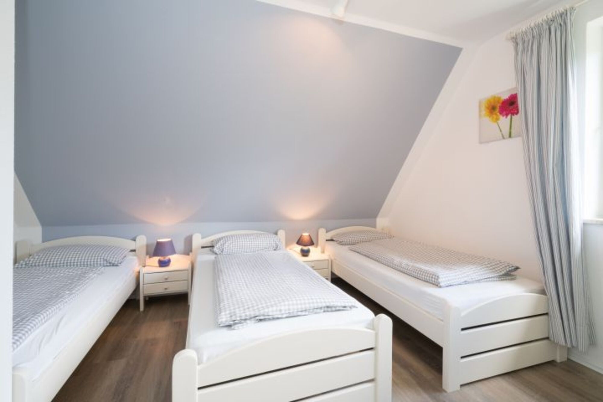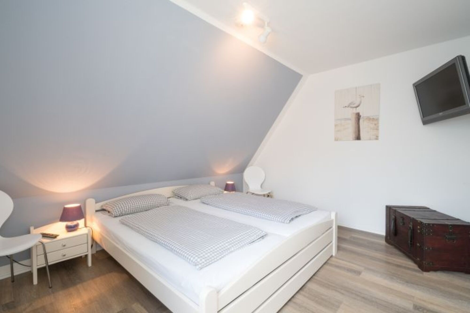 Das Ferienhaus wurde im dänischem Stil und geschmackvoll eingerichtet. Hier können bis zu 5 Personen auf ca. 50 m² mit 2 Etagen einen entspannten Urlaub in St. Peter-Dorf verbringen. Im Erdgeschoss gibt es einen Wohn-/Essbereich mit offener Küche sowie ein Duschbad. Im Obergeschoss befinden sich die 2 Schlafzimmer, von denen eines mit einem Doppelbett und eines mit 3 Einzelbetten ausgestattet ist.