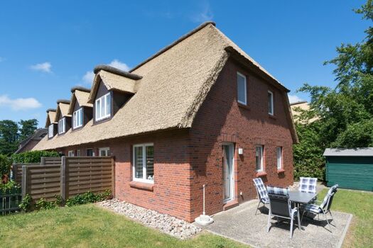 Diese ruhige Reetdach- Reihenhausanlage liegt direkt hinter den Dünen nur 3 Gehminuten vom Dorfzentrum entfernt und 8 Gehminuten zum Seedeich mit Strandübergang.