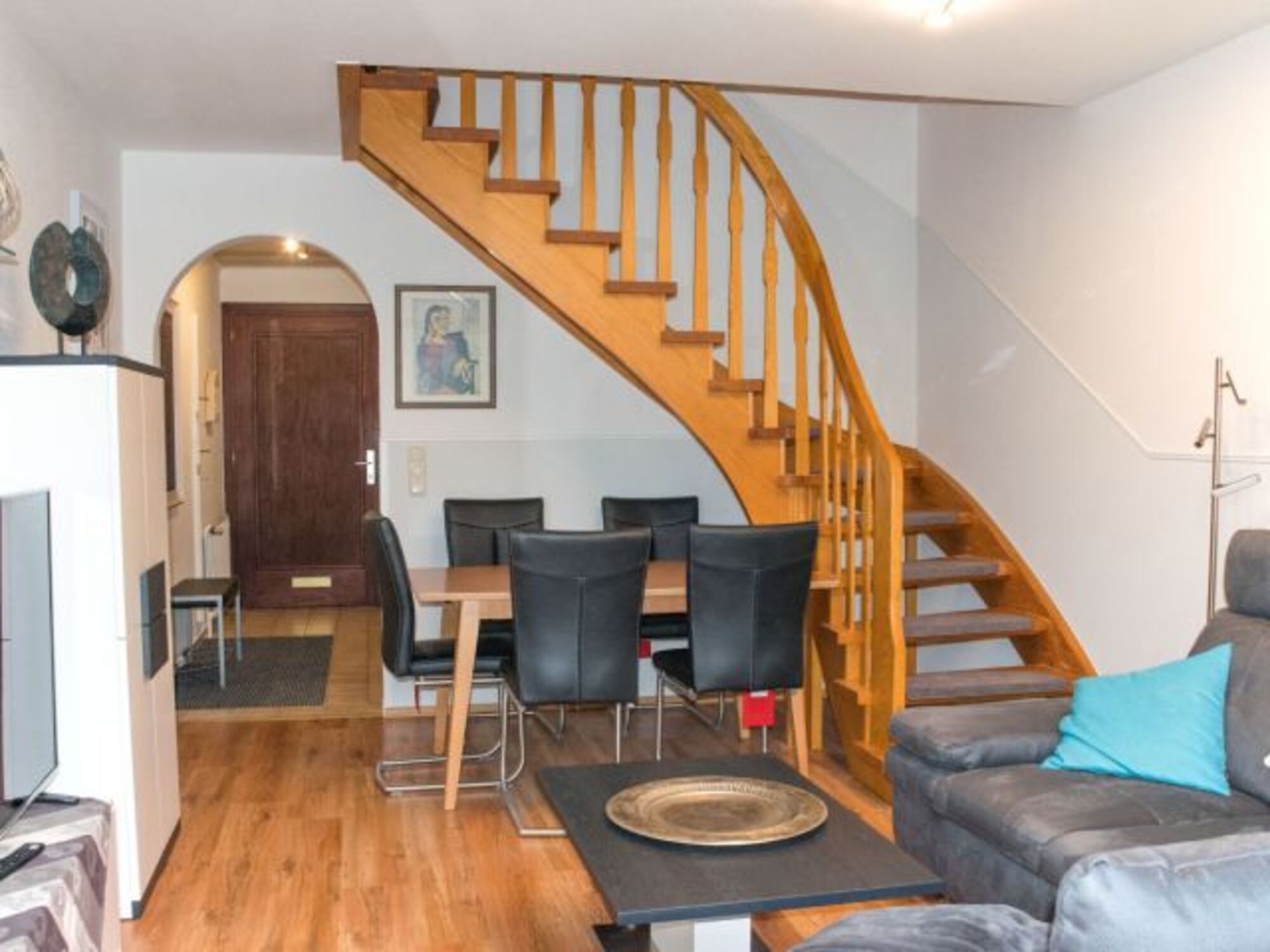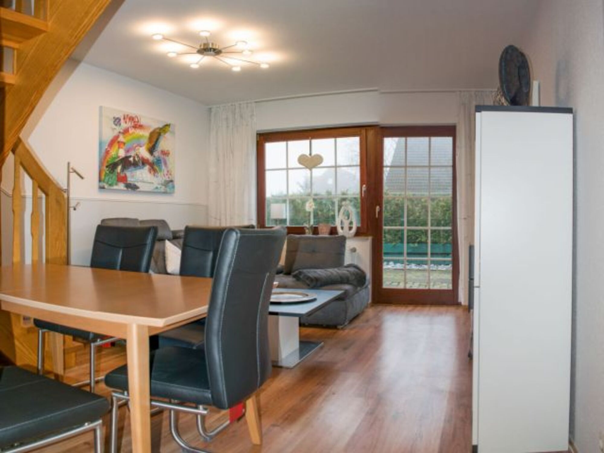 Das Ferienhaus Jadetraum in der Danksteder Str. 7f sorgt für eine erholsame Urlaubszeit. In ruhiger Wohnlage auf der Danksteder Straße finden Sie unsere familien- und hundefreundliche Unterkunft. Das Haus verfügt über 3 Ebenen. Durch den Eingangsbereich mit Garderobe gelangen Sie in das schicke Wohn-/Esszimmer an welches sich eine Terrasse anschließt. Wir bieten hier Smart-TV mit Netflix. Außerdem finden Sie im UG eine separate, gut ausgestattete Küche und ein Gäste-WC mit Abstellraum und einem Waschtrockner. Über eine offene Holztreppe gelangen Sie zum frisch renovierten Fenster-Duschbad, zum ersten Schlafzimmer mit 160x200-Bett und zum Durchgangszimmer mit einem 140x200-Schlafsofa. Das 2. Schlafzimmer mit Doppelbett 160x200 liegt im Dachgeschoss.