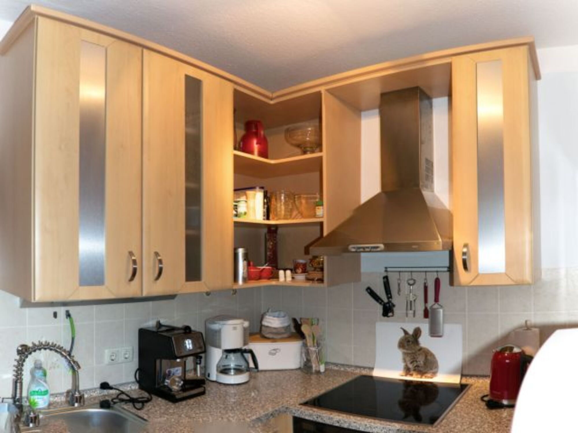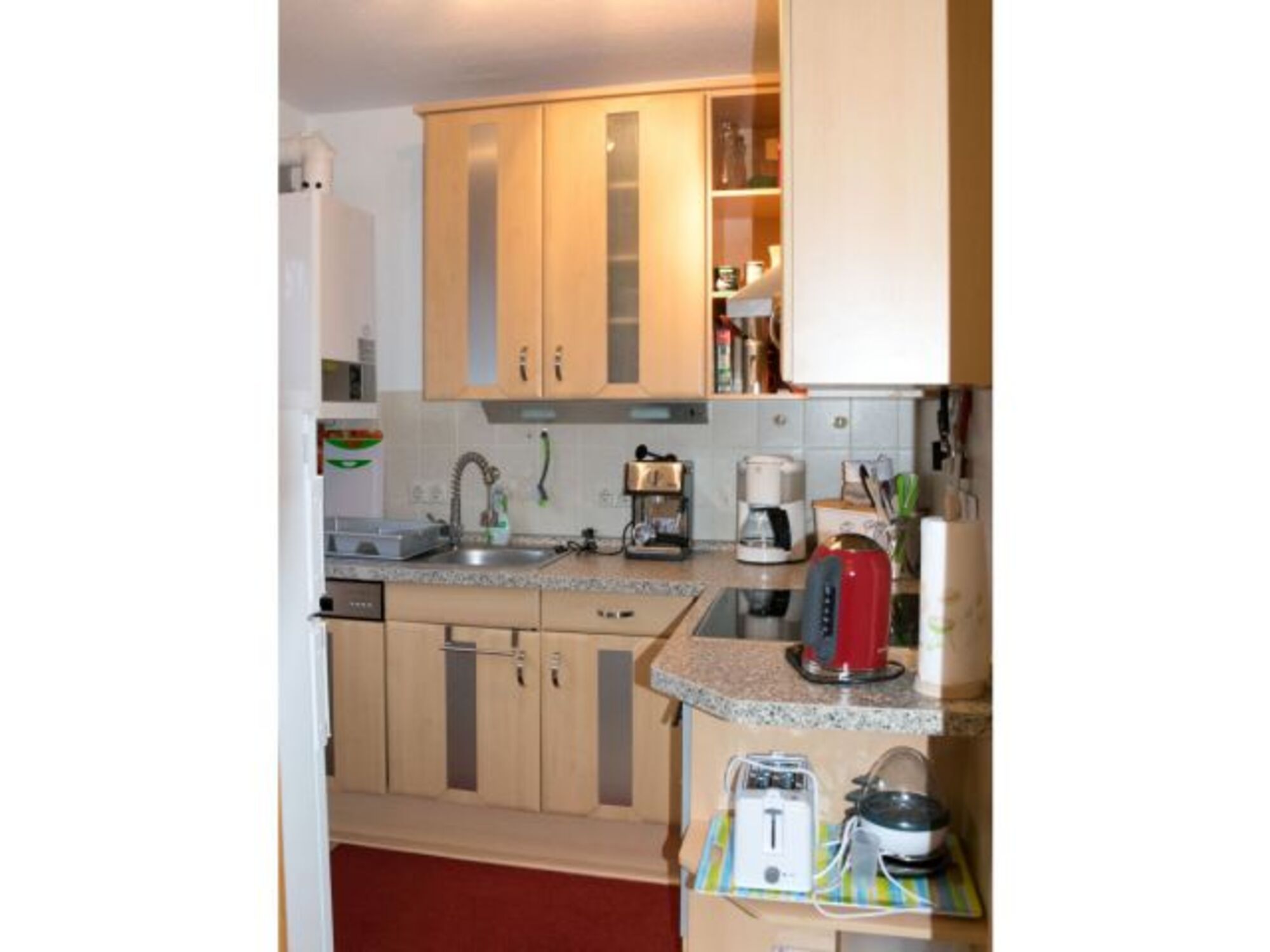 4-Platten Herd, Cerankochfeld, Kühlschrank mit Gefrierfach, Eierkocher, Korkenzieher / Flaschenöffner, Geschirrhandtücher