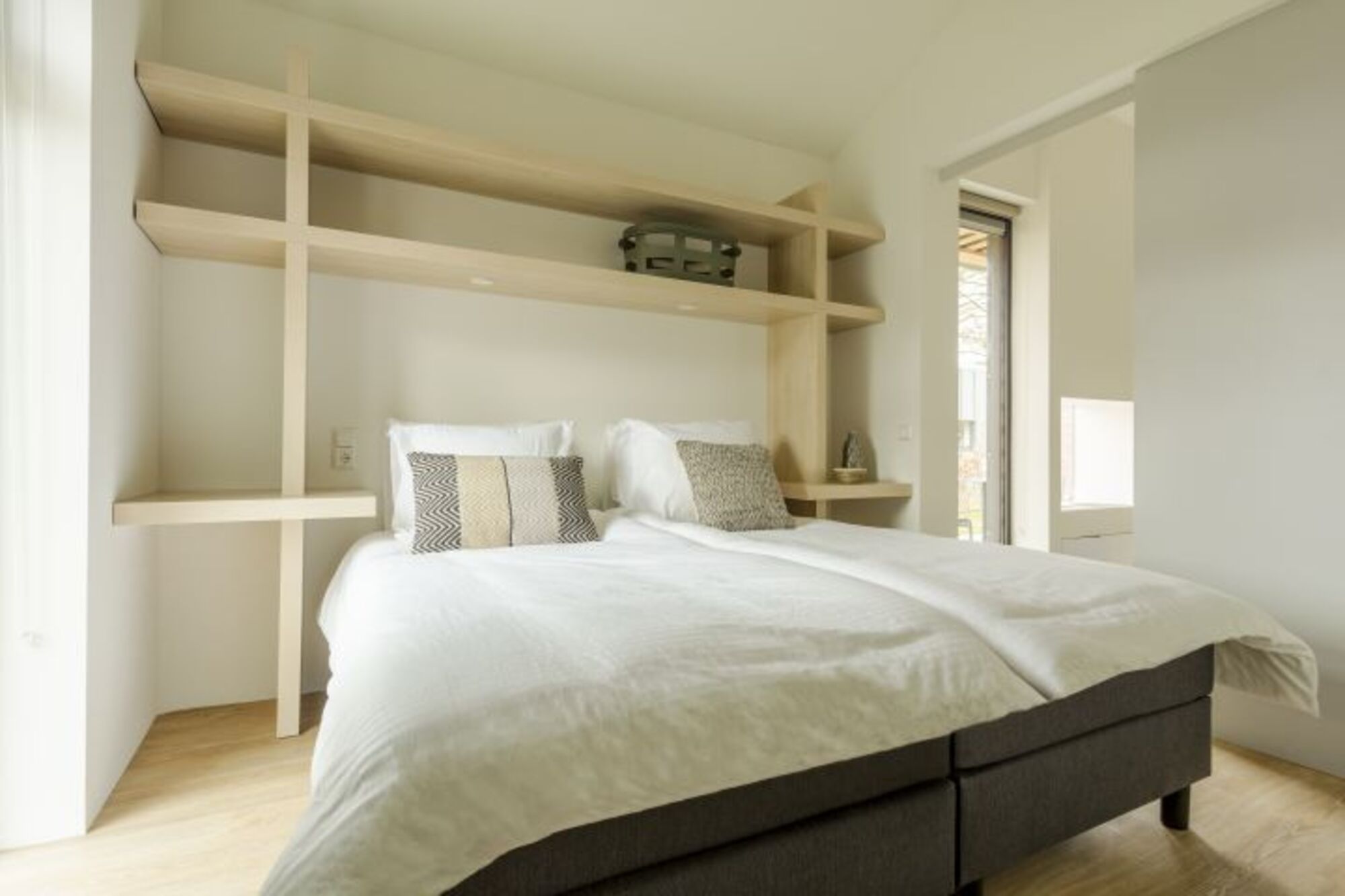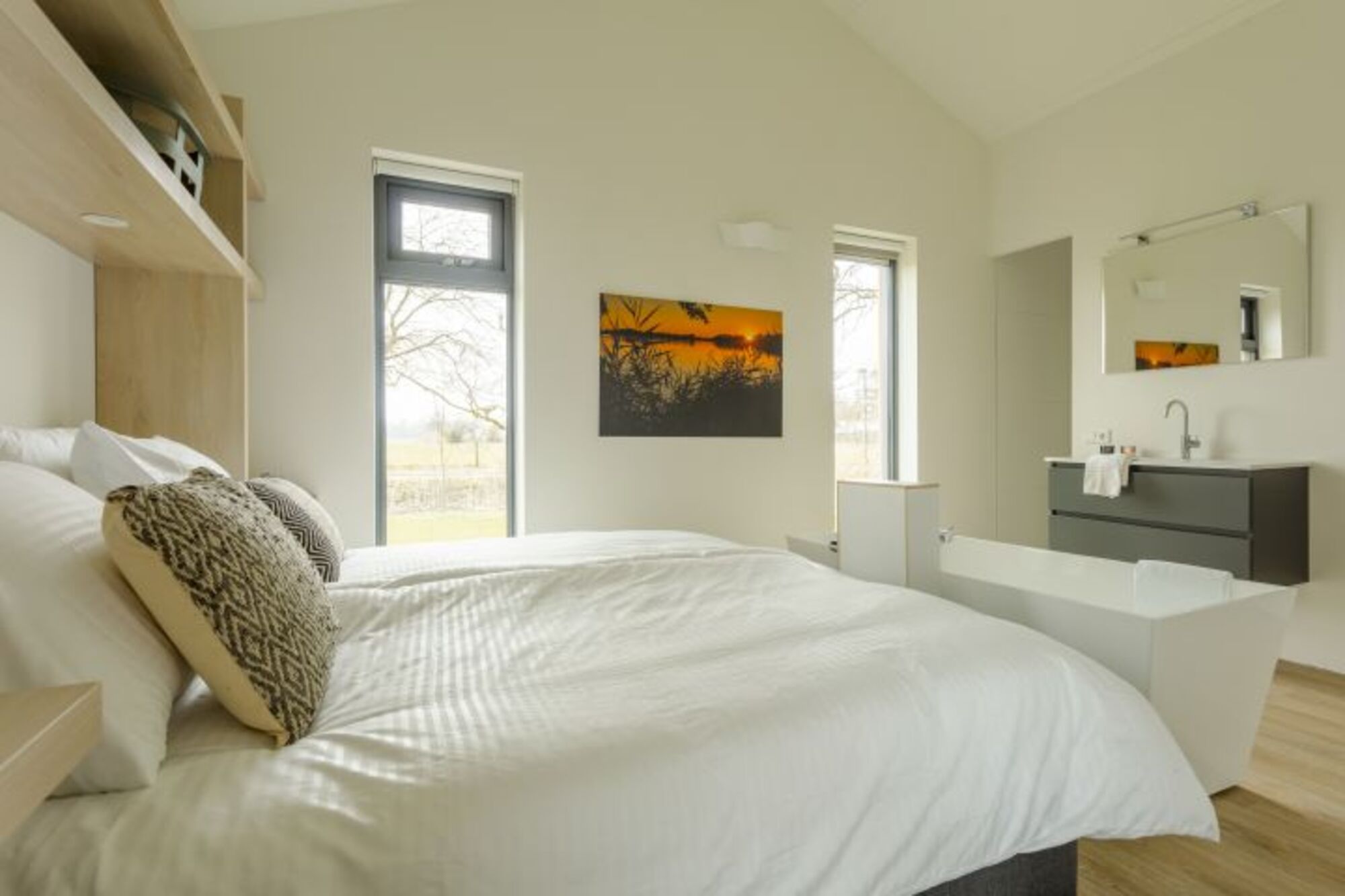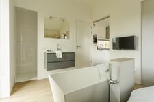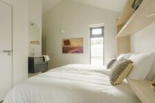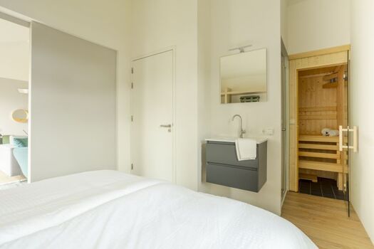 Auf beiden Seiten des Wohnzimmers liegt je ein Schlafzimmer mit eigenem Badezimmer. Beide Schlafzimmer lassen sich mit Schiebetüren schließen oder öffnen und ins Wohnzimmer integrieren. Das erste Schlafzimmer verfügt über ein Doppelbett, einen Flachbildfernseher und eine hübsche freistehende Badewanne. Dazu kommt eine Dusche und ein separates WC. Im zweiten Schlafzimmer profitieren Sie neben dem Doppelbett, der Dusche und der separaten Toilette auch von Ihrer eigenen Infrarot Sauna! An einem kühlen oder regnerischen Tag eine willkommene Abwechslung.