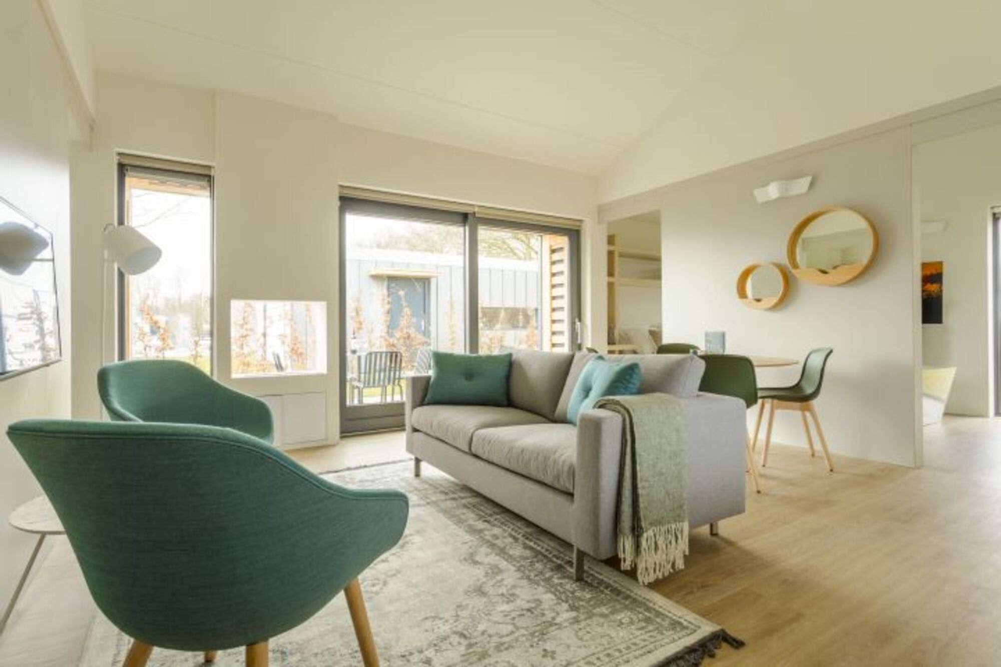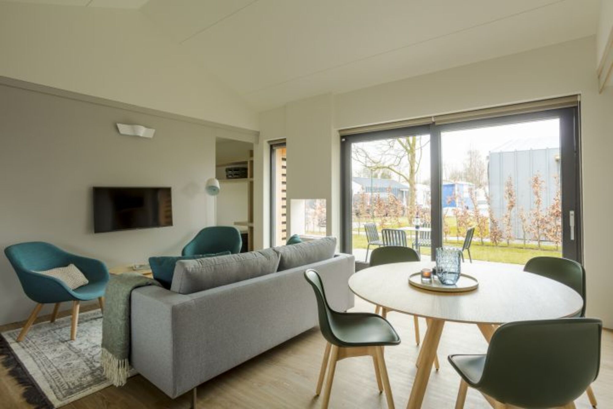 Das sehr komfortabel ausgestattete Wohnzimmer ist dank der großen Glasflächen im Giebel lichtdurchflutet. Neben der Sitzecke mit Flachbildfernseher.