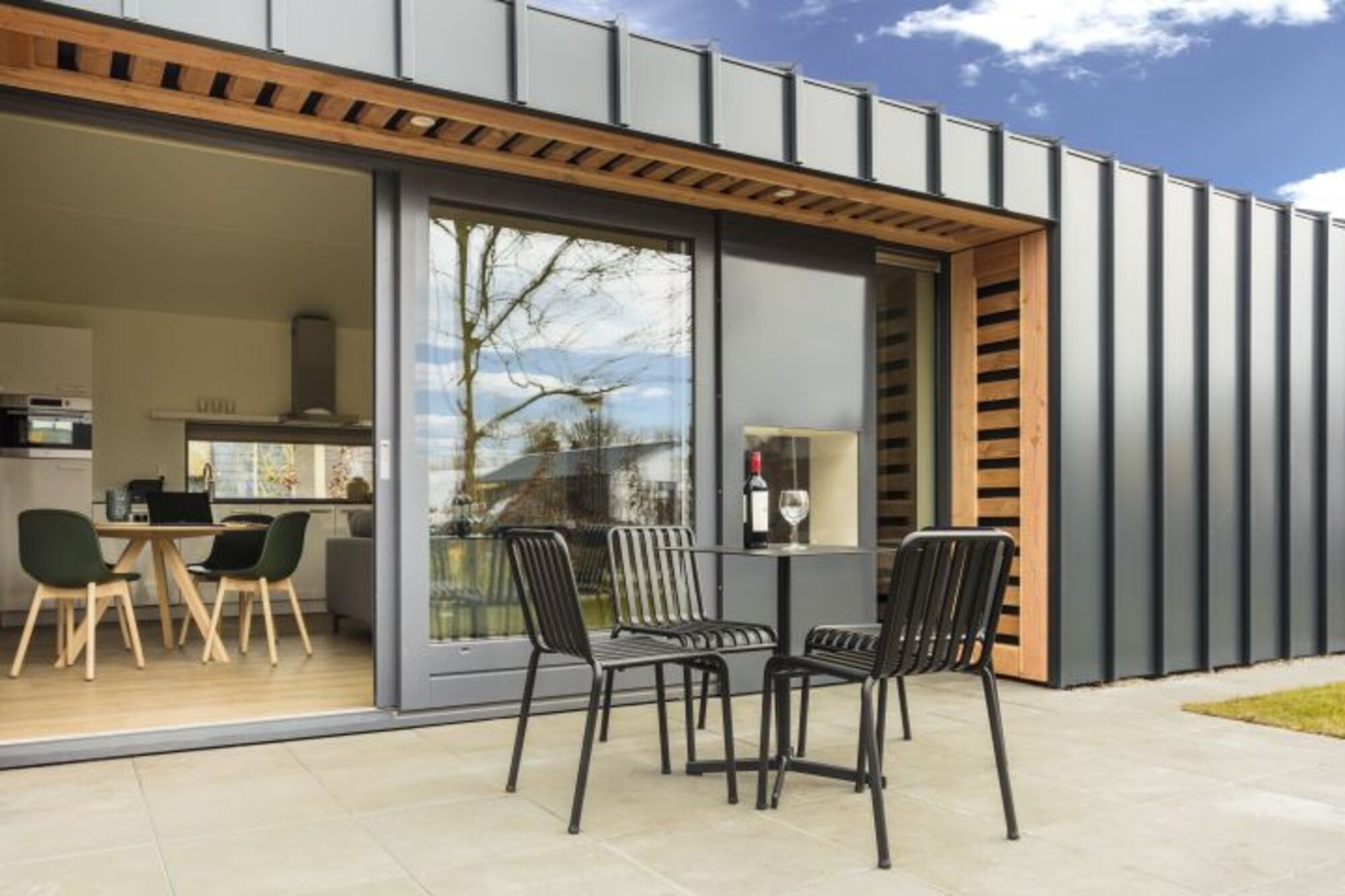 Über die großen Schiebetüren aus Glas gelangen Sie auf die Sonnenterrasse mit Sitzecke. Hier gönnt man sich gerne ein gutes Glas Wein am Kamin und sitzt bis in den späten Abend hinein zusammen.