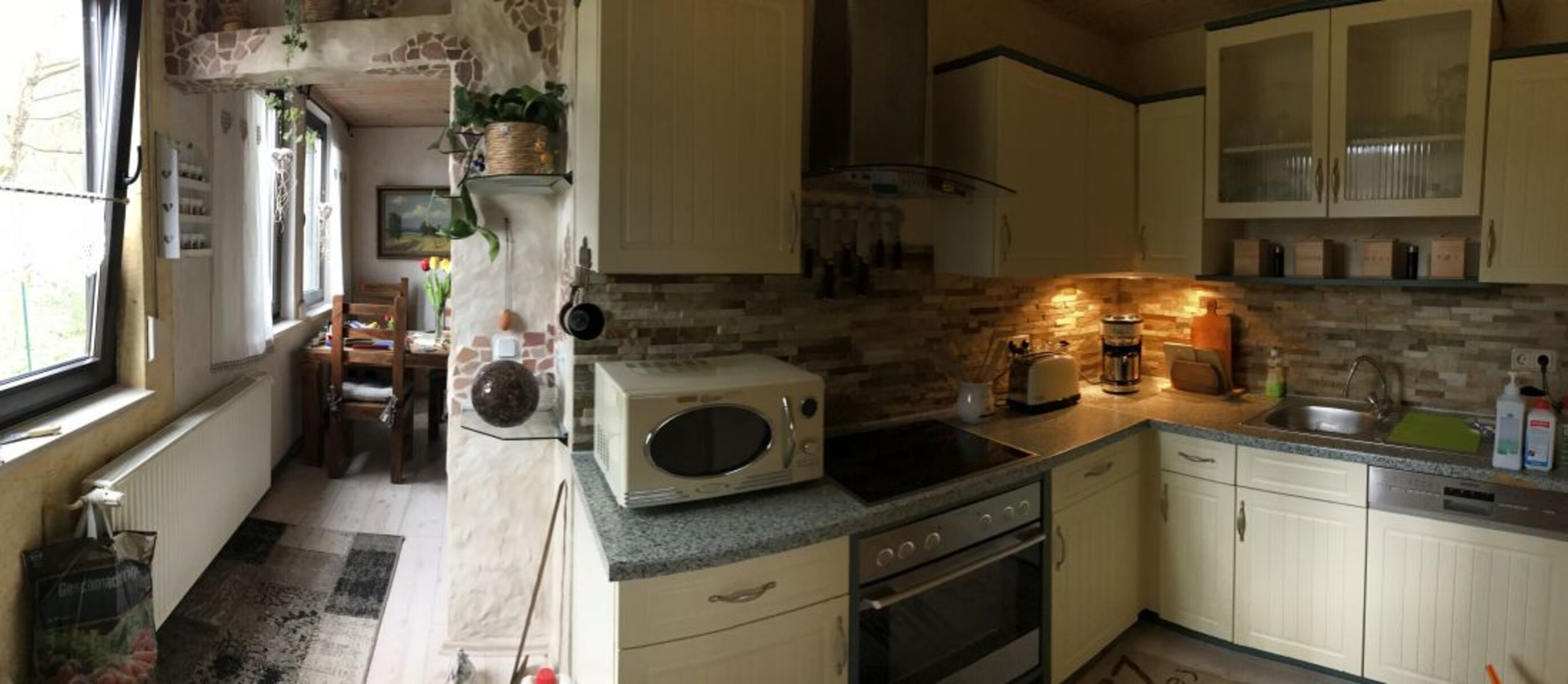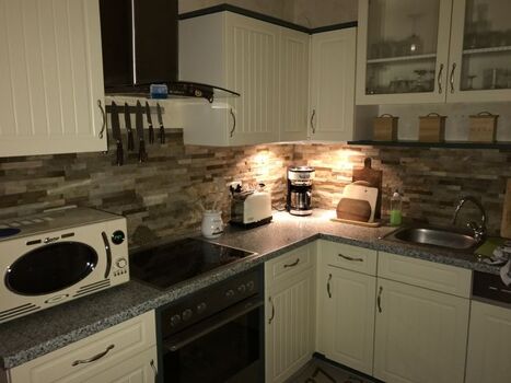 4-Platten Herd, Cerankochfeld, Dunstabzugshaube, Kühlschrank mit Gefrierfach, Kaffeevollautomat, Tassimo-Kaffeautomat, Eierkocher, Korkenzieher / Flaschenöffner, Gewürze (Salz, Pfeffer, Zucker), Geschirrhandtücher, Mülltüten