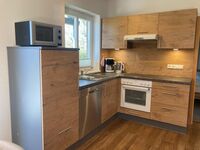 4-Platten Herd, Cerankochfeld, Dunstabzugshaube, Kühlschrank mit Gefrierfach, Korkenzieher / Flaschenöffner, Gewürze (Salz, Pfeffer, Zucker), Geschirrhandtücher, Mülltüten, Essplatz in der Küche