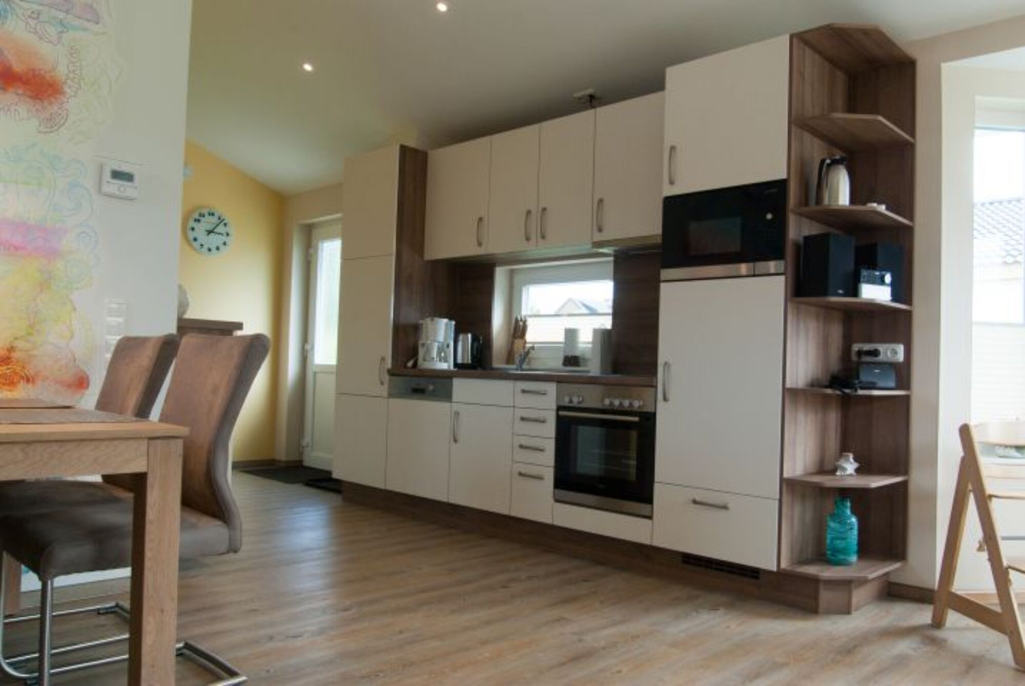Cerankochfeld, Dunstabzugshaube, Kühlschrank mit Gefrierfach, Eierkocher, Mixer, Korkenzieher / Flaschenöffner, Gewürze (Salz, Pfeffer, Zucker), Öl / Essig, Mülltüten