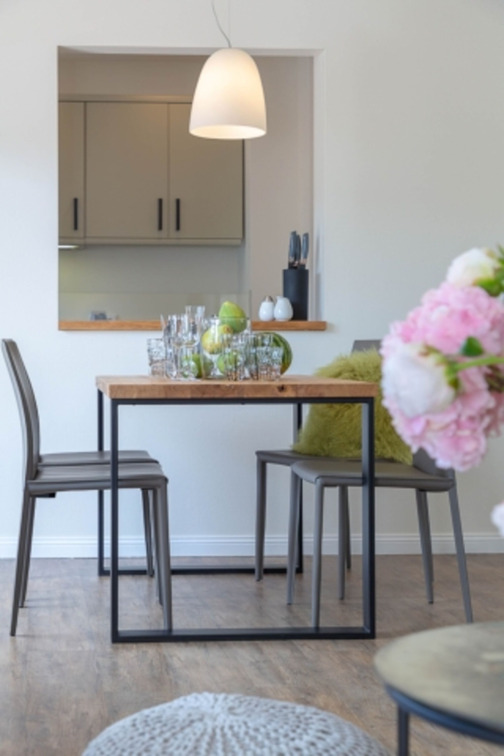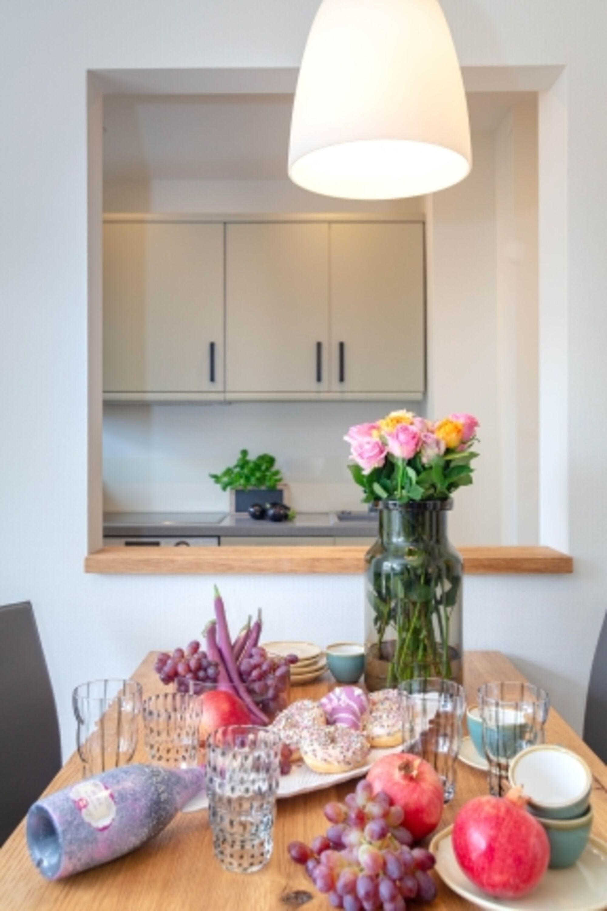 Cerankochfeld, Dunstabzugshaube, Kühlschrank mit Gefrierfach, Nespresso-Automat, Eierkocher, Mixer, Korkenzieher / Flaschenöffner, Gewürze (Salz, Pfeffer, Zucker), Geschirrhandtücher, Mülltüten