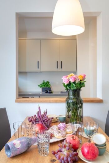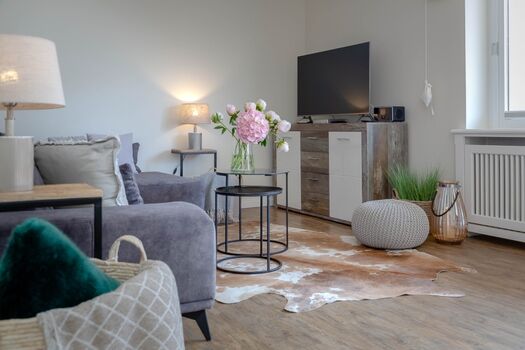 Die Ferienwohnung ist modern und komfortabel gestaltet, wobei viel Wert auf Details gelegt wurde. Die offene Küche zum Wohnzimmer ist mit allen Annehmlichkeiten ausgestattet, die man sich wünschen kann: ein Cerankochfeld, Backofen, Mikrowelle, Kühlschrank mit Gefrierfach, Geschirrspüler sowie eine Nespresso-Maschine für den perfekten Kaffeegenuss am Morgen. Der gemütliche Essbereich lädt zu gemeinsamen Mahlzeiten ein, während die Sofaecke im Wohnzimmer für entspannte Stunden sorgt – vielleicht bei einem Film auf einem der beiden Fernseher mit internationalen Kanälen.