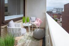 Ein besonderes Highlight ist die überdachte Terrasse, auf der Sie die frische Sylter Luft genießen können, während Sie Ihre Lieblingslektüre lesen oder den Tag bei einem Glas Wein ausklingen lassen. Der Blick von hier ist einfach unvergesslich, und die ruhige Atmosphäre des Balkons lädt zu erholsamen Momenten ein.