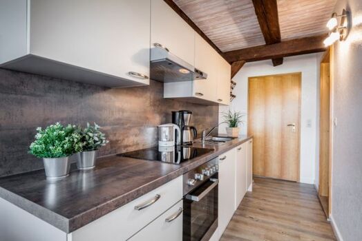 Cerankochfeld, Dunstabzugshaube, Kühlschrank mit Gefrierfach, Eierkocher, Korkenzieher / Flaschenöffner, Geschirrhandtücher, Mülltüten, Essplatz in der Küche