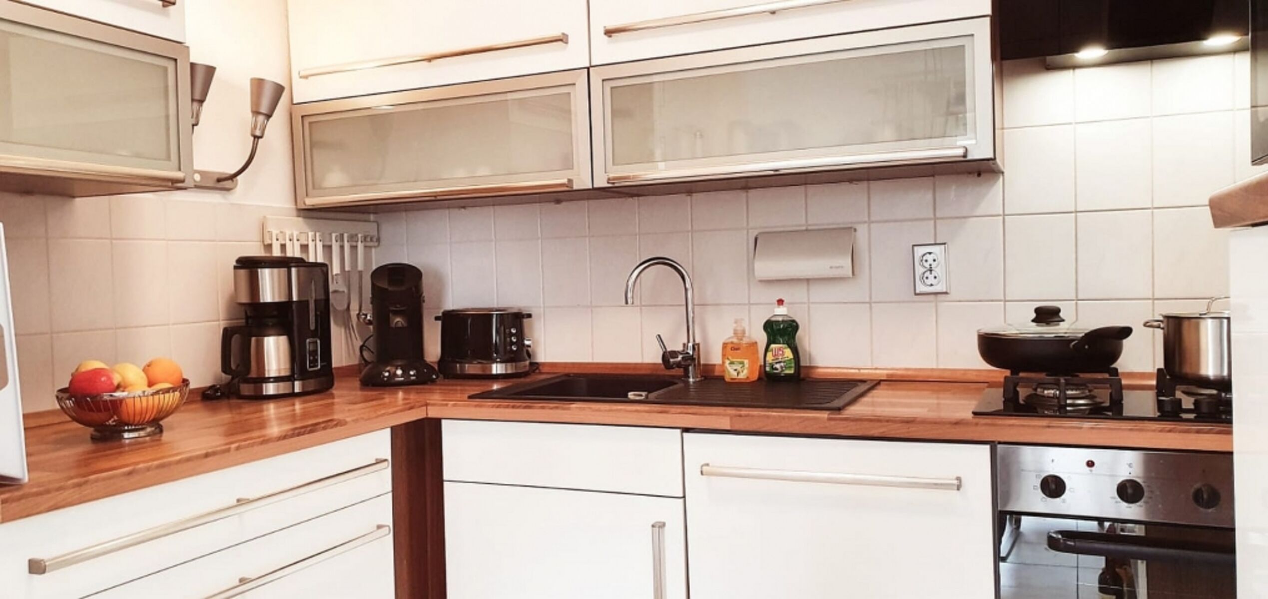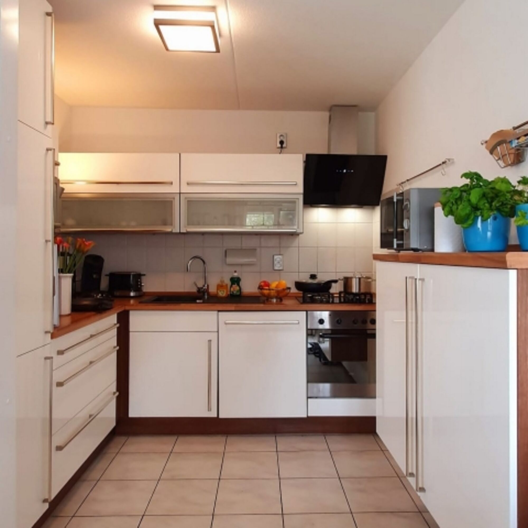 Cerankochfeld, Gasofen / Gasherd, Dunstabzugshaube, Gefrierschrank, Senseo-Kaffeeautomat, Eierkocher, Mixer, Korkenzieher / Flaschenöffner
