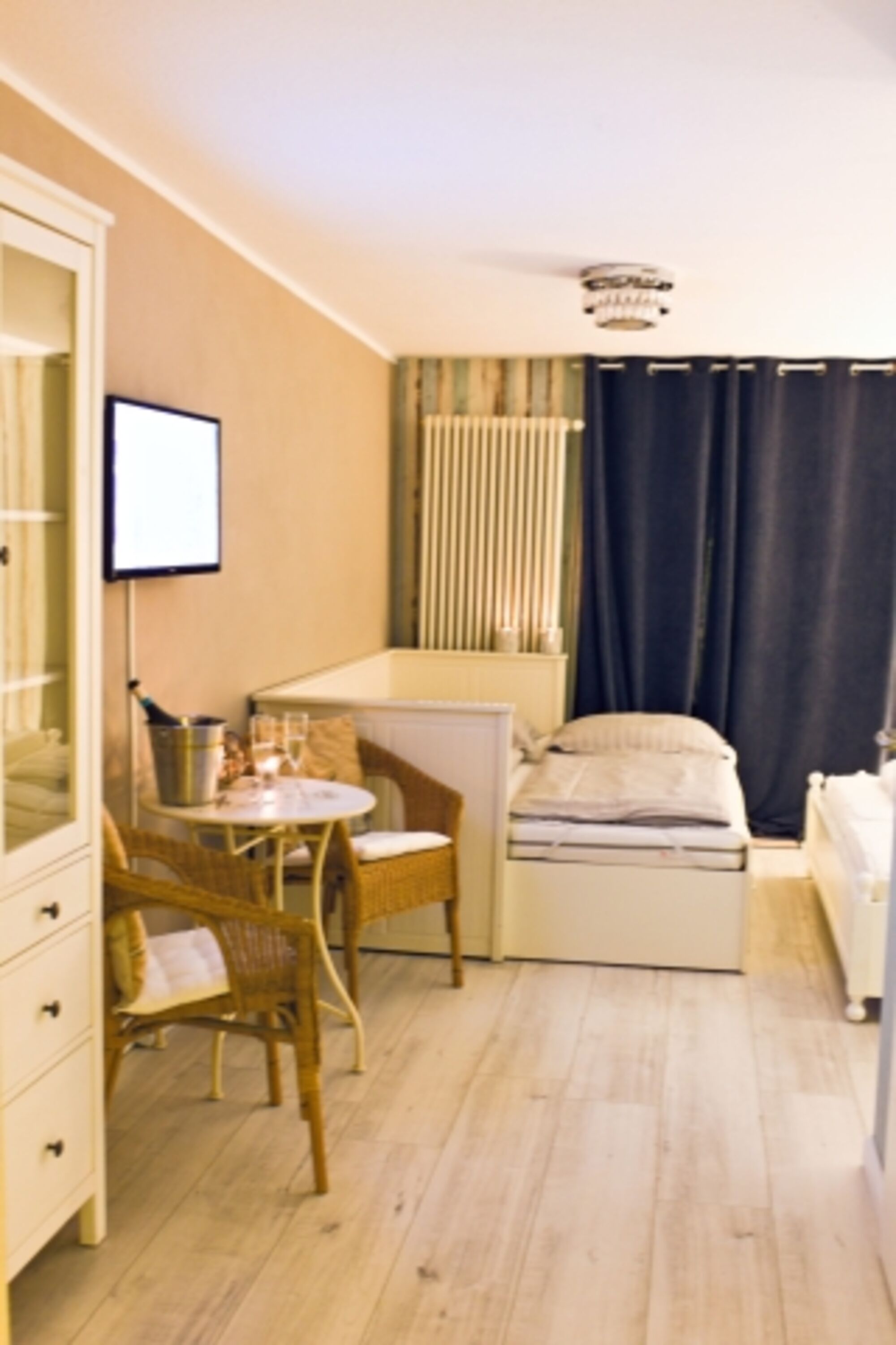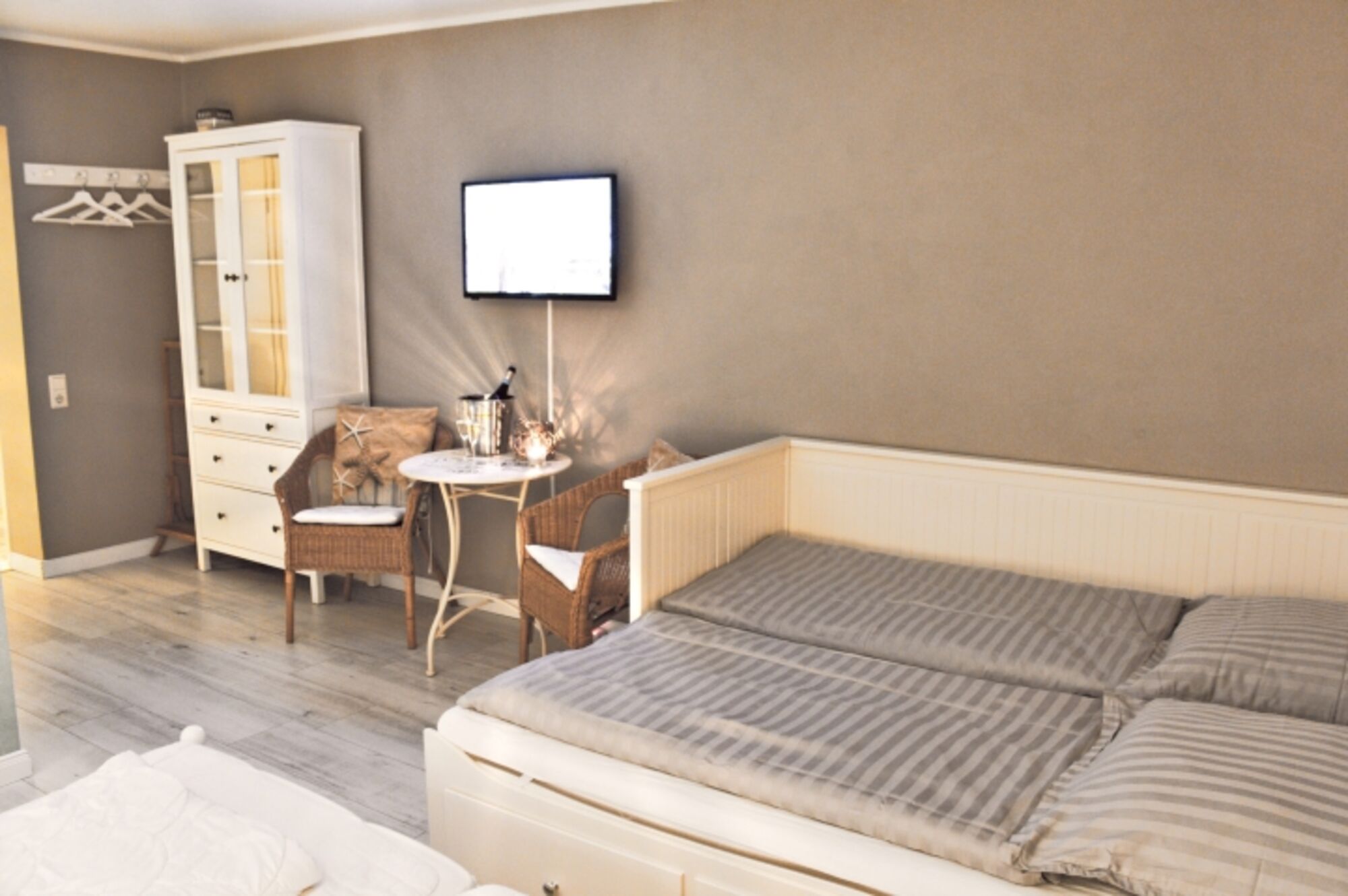 Als zusätzliche Schlafmöglichkeit bieten wir in diesem Schlafzimmer ein Einzelbett an, das sich bei Bedarf zu einem Doppelbett ausziehen lässt und so bequem Platz für zwei Personen bietet. Doppelbett 1,80 x 2,00m, Doppelbett 1,60 x 2,00m, Einzelbett, Kommode, Spiegel