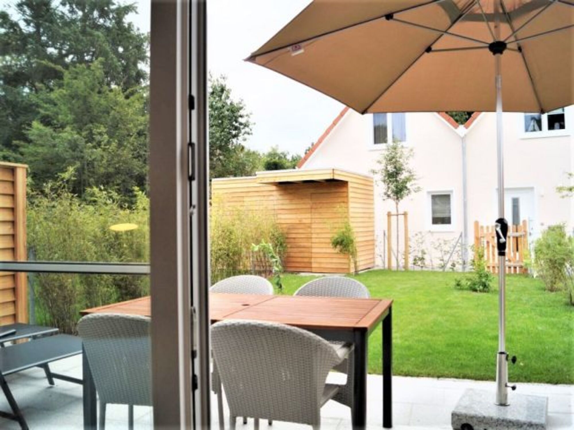 Terrasse mit Gartenmöbeln/ Sonnenschirm, Mückenschutzfenster