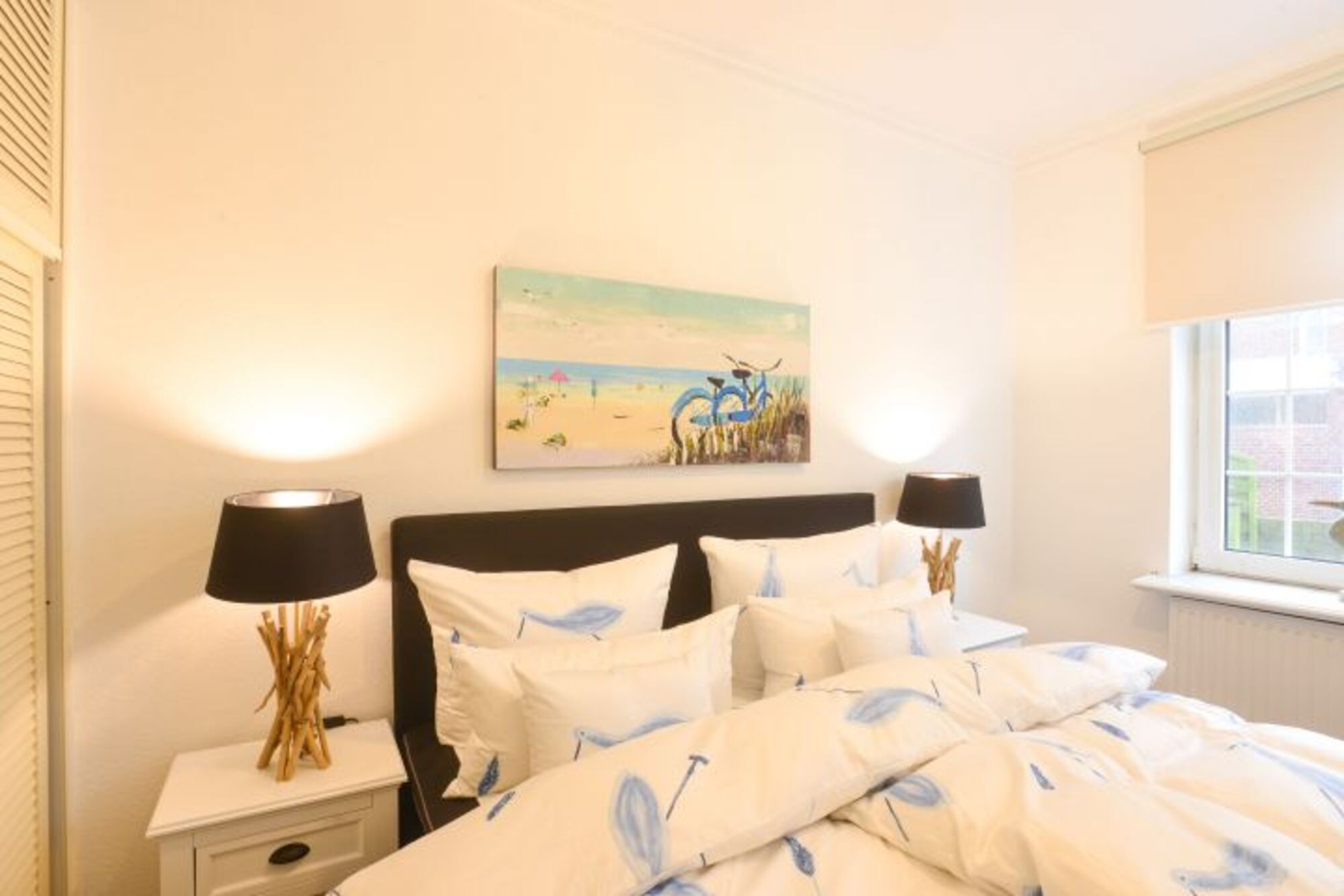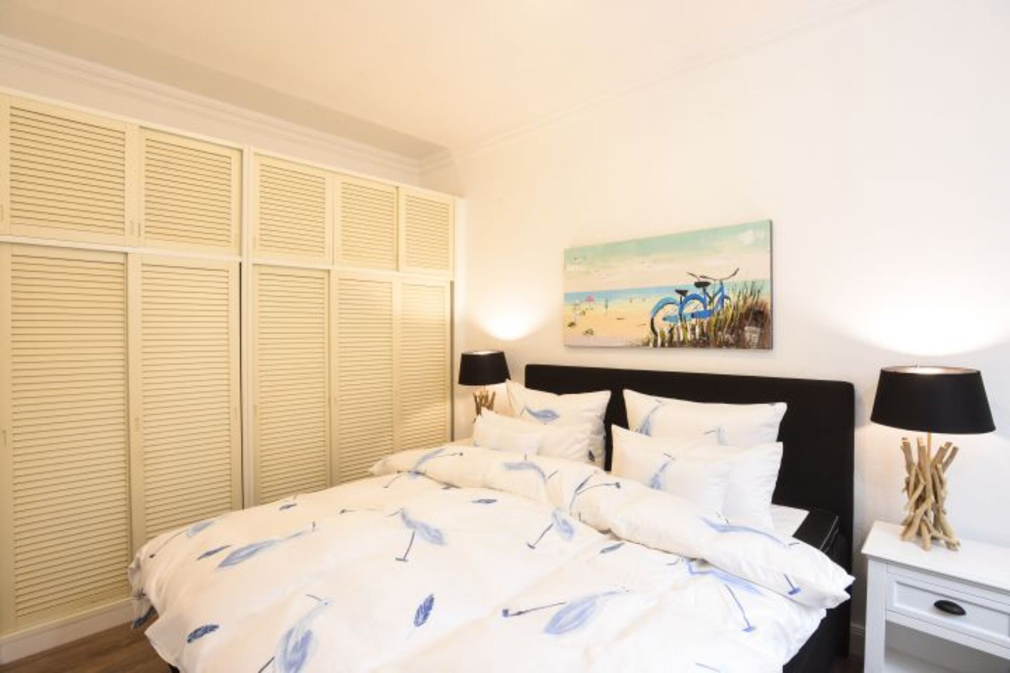 Im Schlafzimmer mit großem Boxspringbett und großem Kleiderschrank lässt es sich gemütlich schlafen.