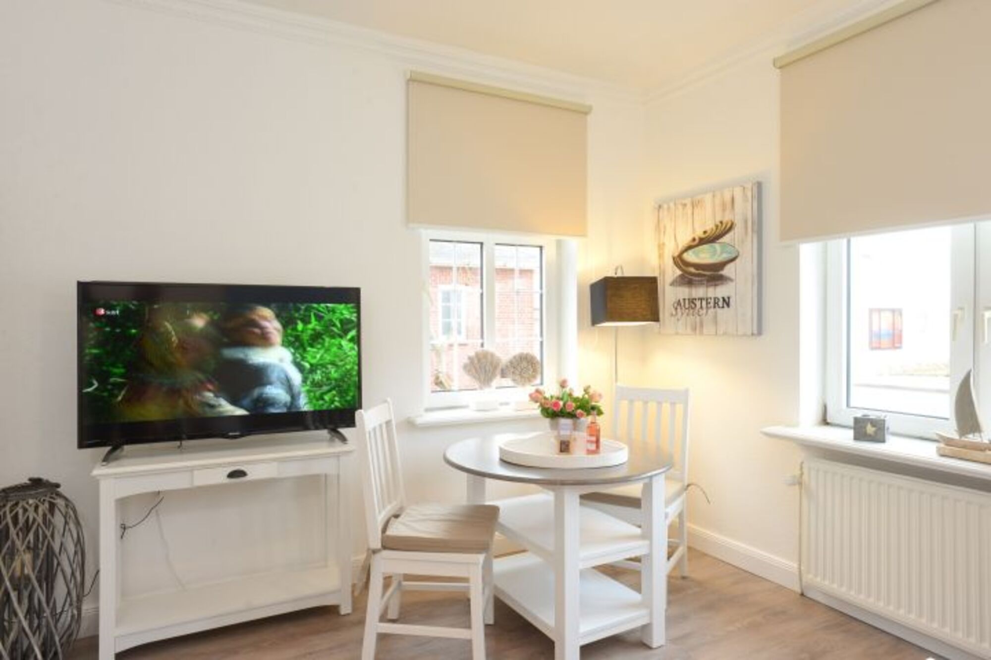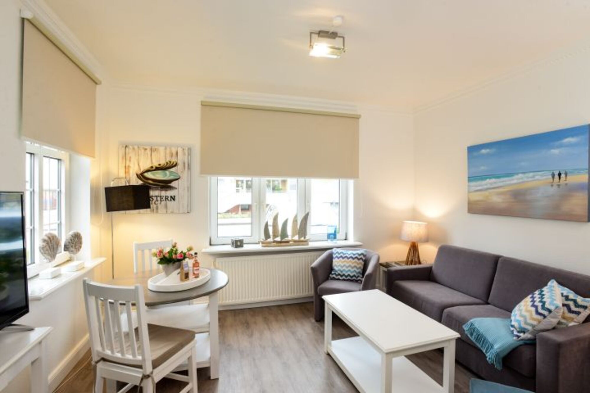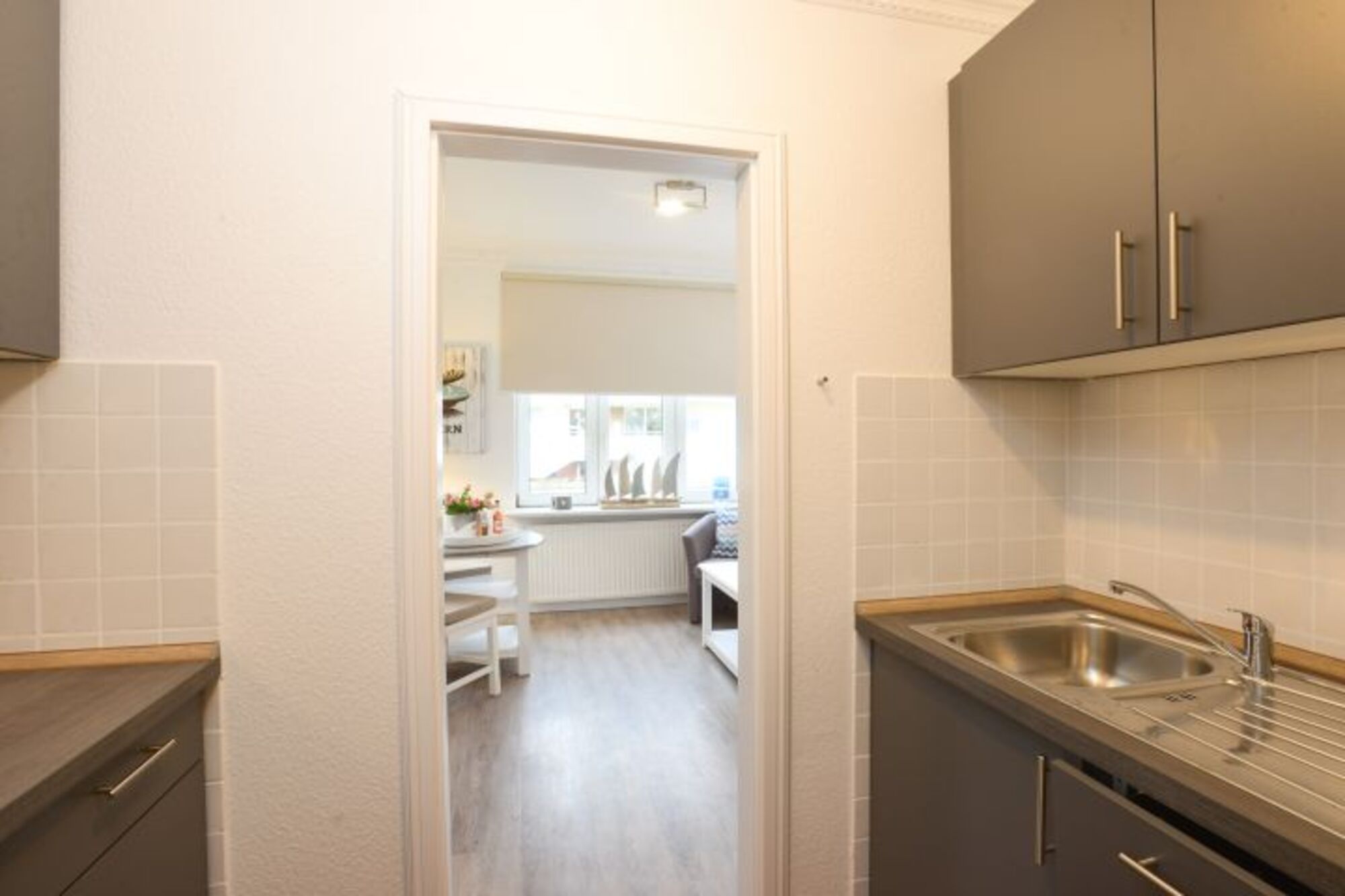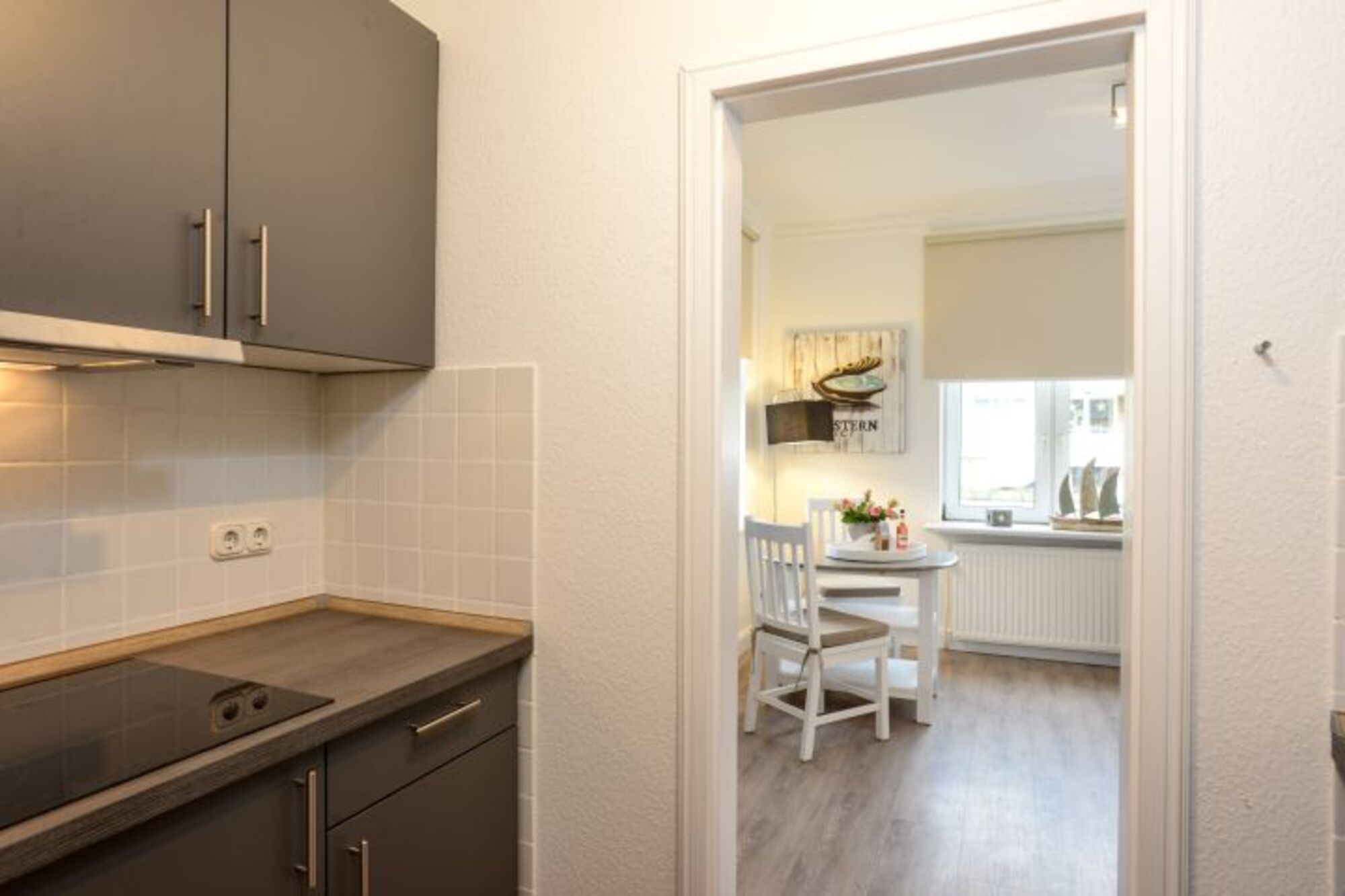 Kleine, süße Ferienwohnung nur wenige Schritte zum Strand und zum Zentrum. Perfekt für beides. Hell und freundlich begrüßt Sie das Appartement im Erdgeschoss des Hauses. Klein aber fein mit Liebe zum Detail eingerichtet. Das Wohnzimmer mit Schlafcouch ist mit Essecke und großem TV ausgestattet. Die kleine Küche ist praktisch und das wichtigste ist vorhanden.