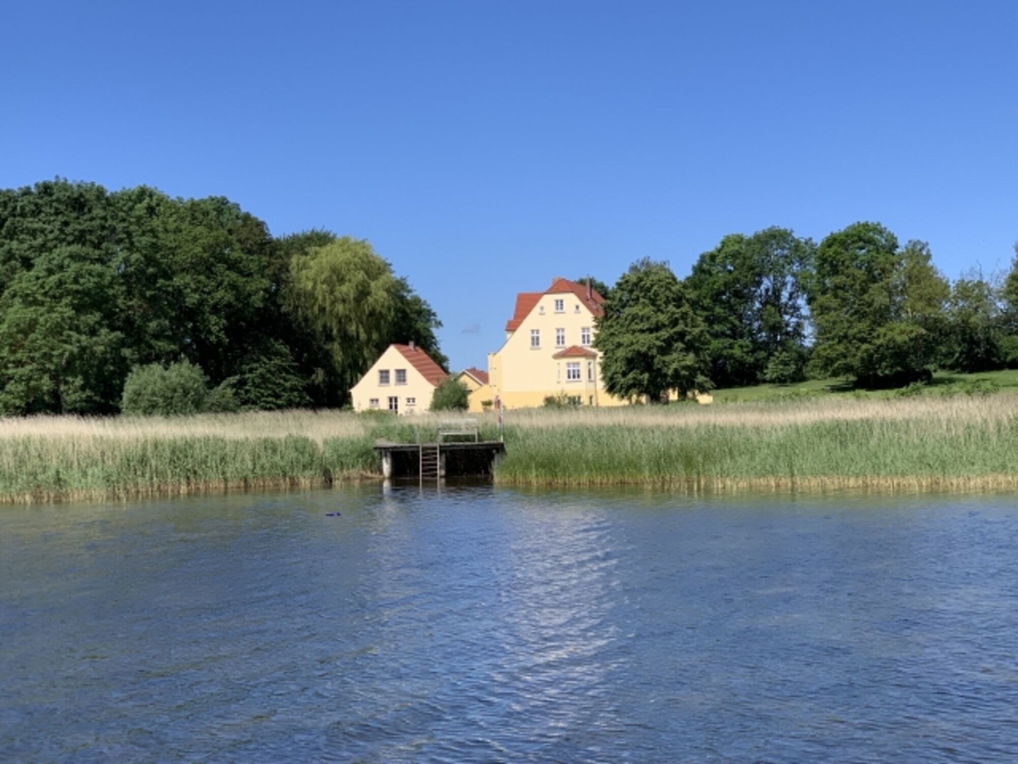 Der große Garten des Gutshauses bietet den Ruhesuchenden und den Aktiven gleichermaßen einen perfekten Raum für vielseitige Aktivitäten: Verschiedene abgeschlossene Bereiche mit Liegestühlen und Tischen, eine große Aussichtsterrasse am Schilfgürtel, der Badesteg, der Grillbereich sowie eine Kinderspielecke mit Sandkiste, zwei Schaukeln und Fußballtoren stehen unseren Gästen zur freien Verfügung.