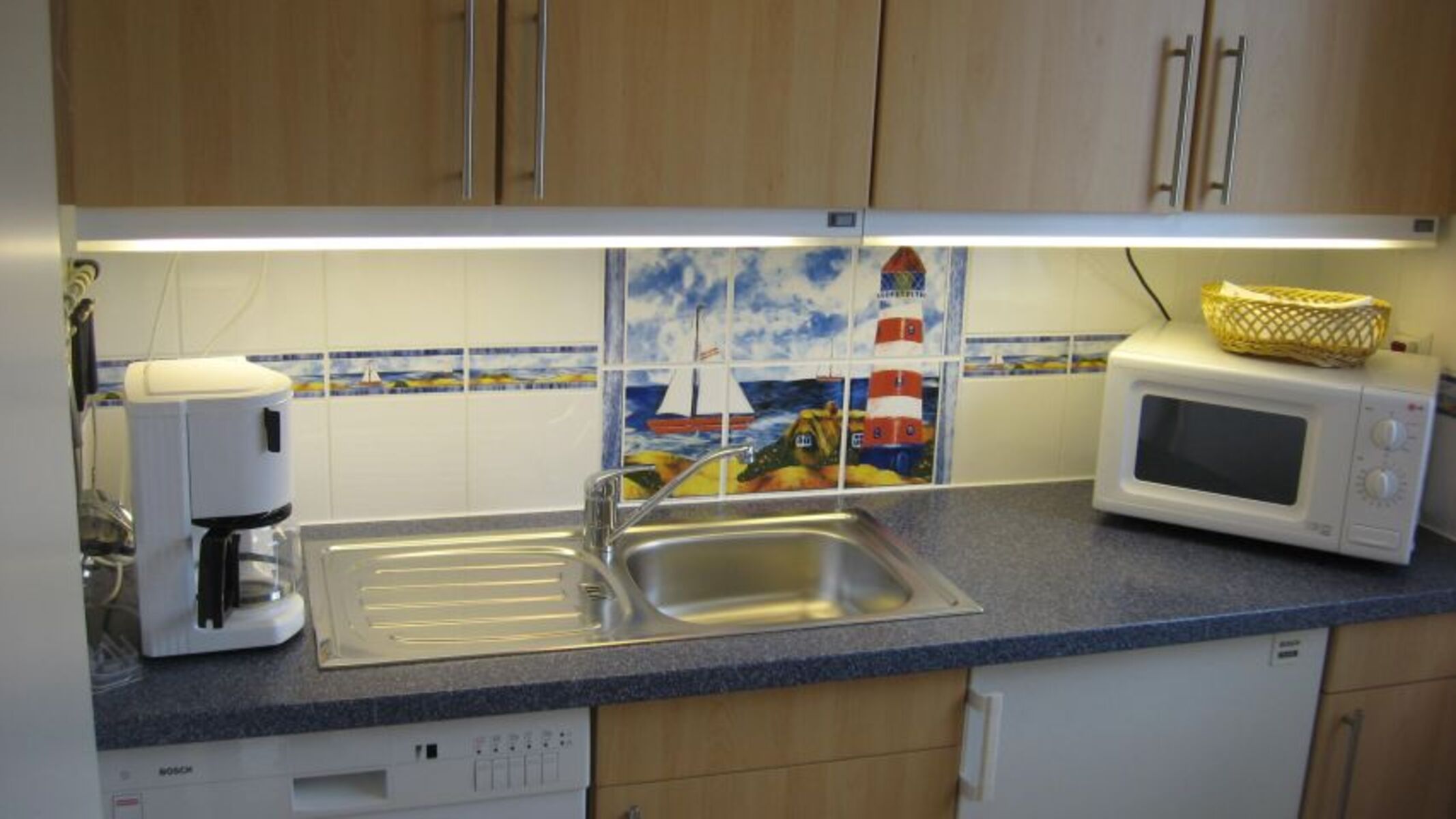 Cerankochfeld, Dunstabzugshaube, Kühlschrank mit Gefrierfach, Korkenzieher / Flaschenöffner, Geschirrhandtücher