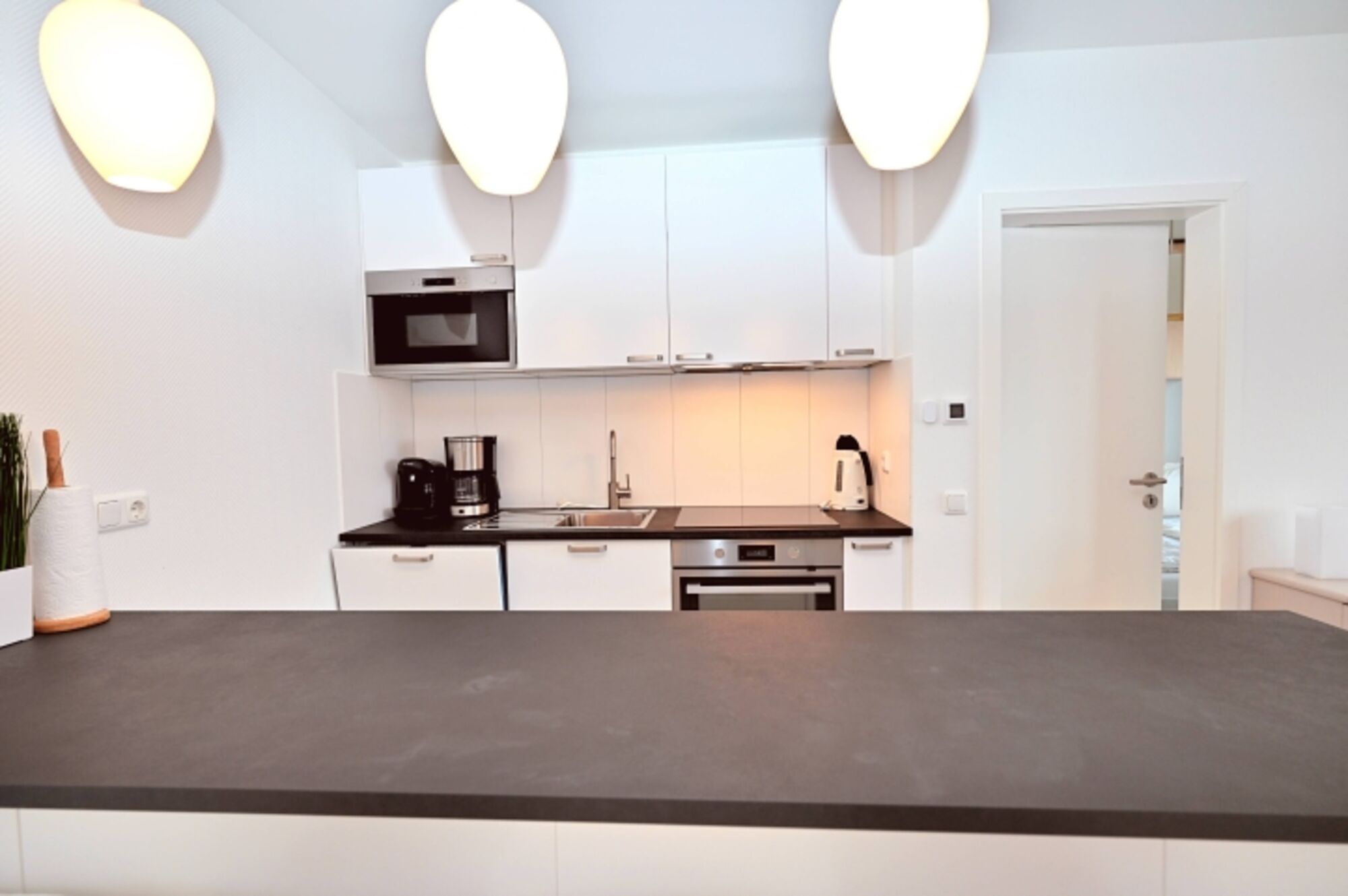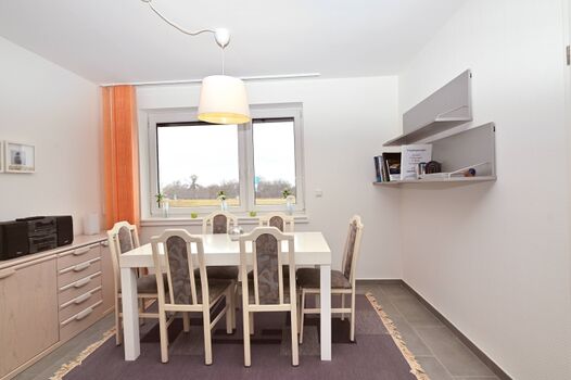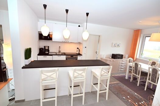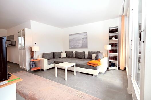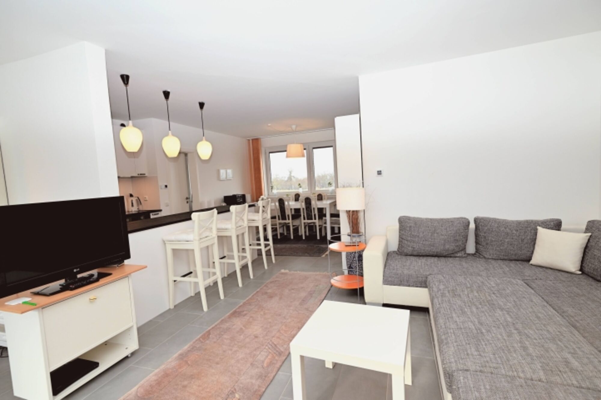 Die Wohnung verfügt über ein großzügiges Wohnzimmer mit angeschlossener offener Küche sowie Essecke für 6 Personen