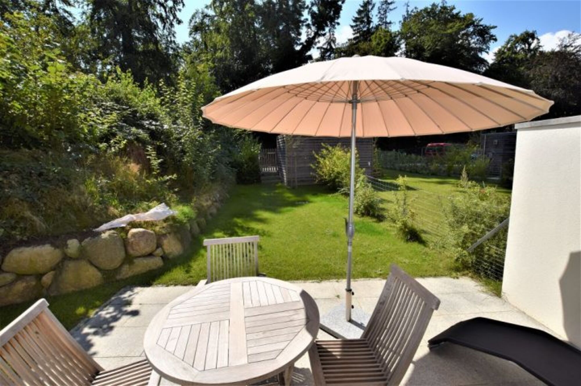 Die große möblierte Sonnenterrasse sowie der Garten laden zum Verweilen ein.