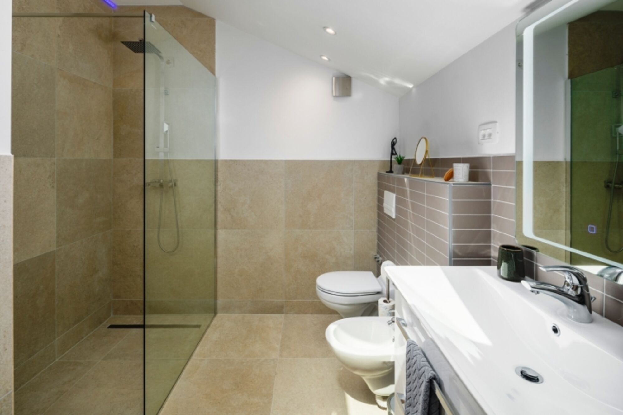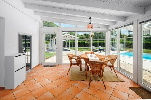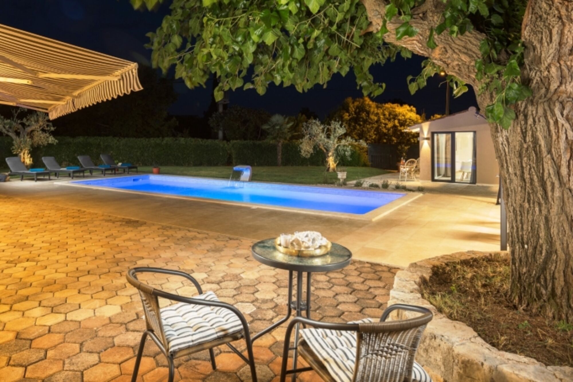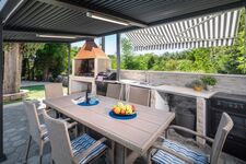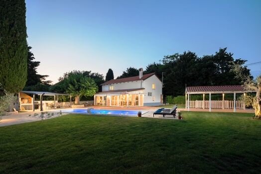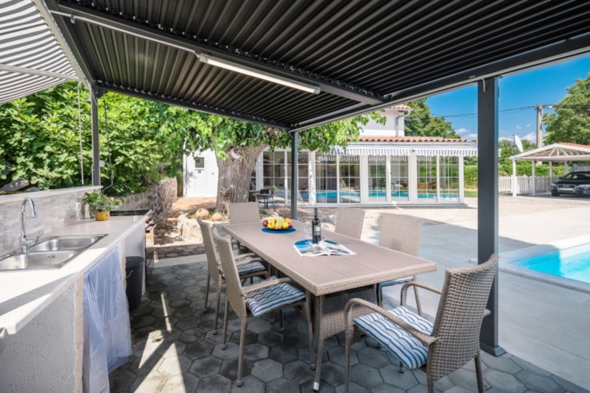 Der Wintergarten mit der gemütlichen Sitzecke hat direkten Zugang zur Terrasse und der überdachten Sommerküche mit Grill. Im großzügigen Außen-Essbereich lässt sich fangfrischer Fisch, istrianischer Schinken mit Käse und beste Weine in vollen Zügen genießen. Der Poolbereich umgeben von mediterraner Natur und die alten Olivenbäume vervollständigen diese gemütliche Atmosphäre.