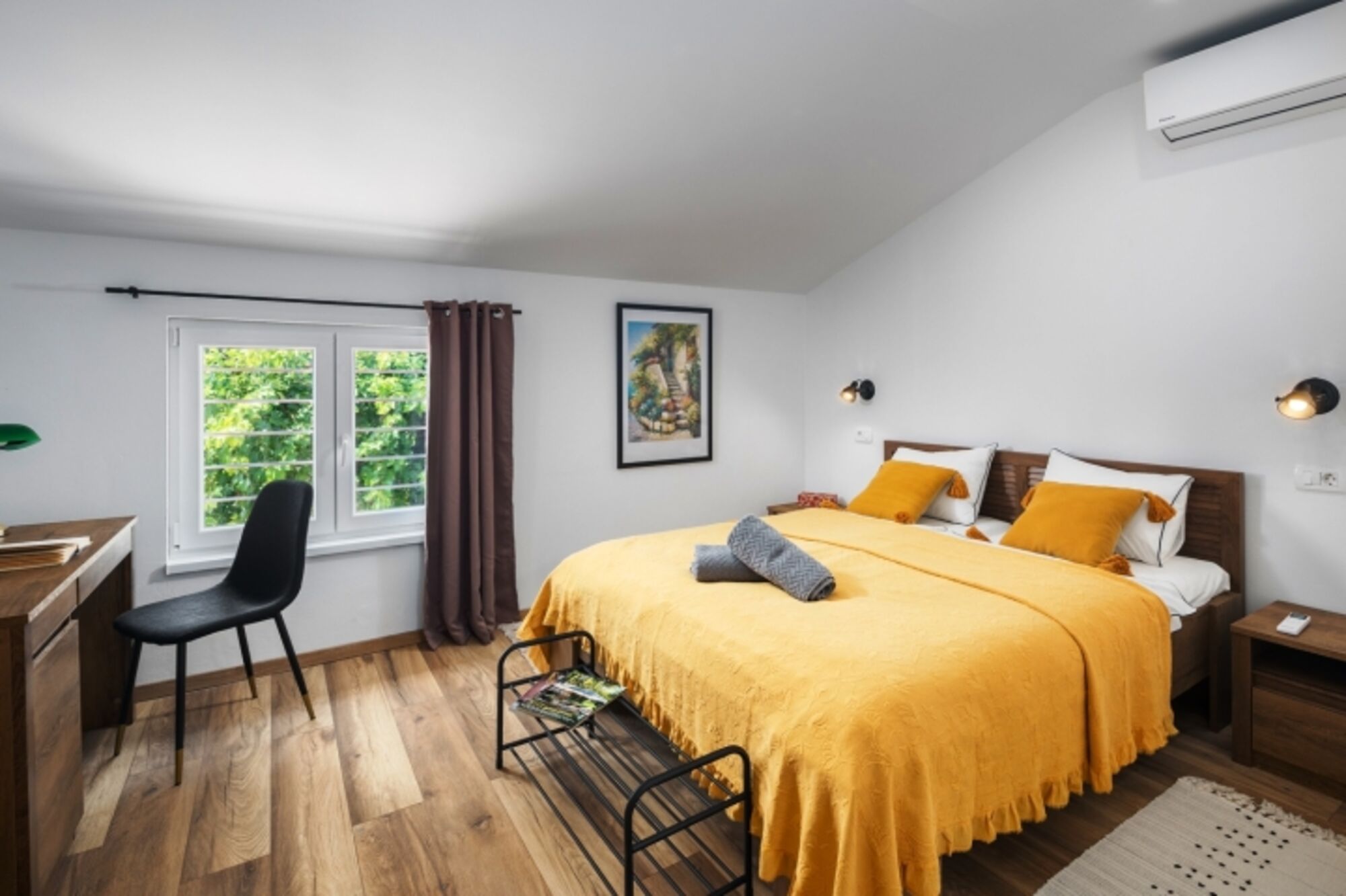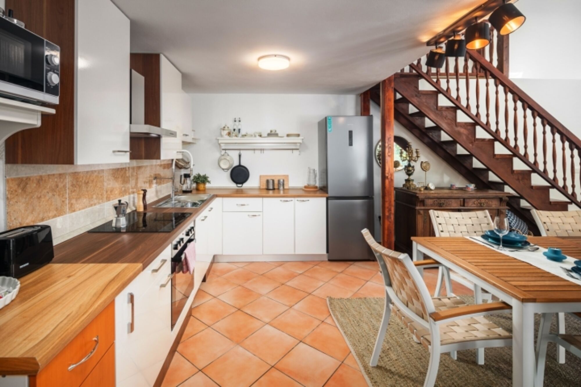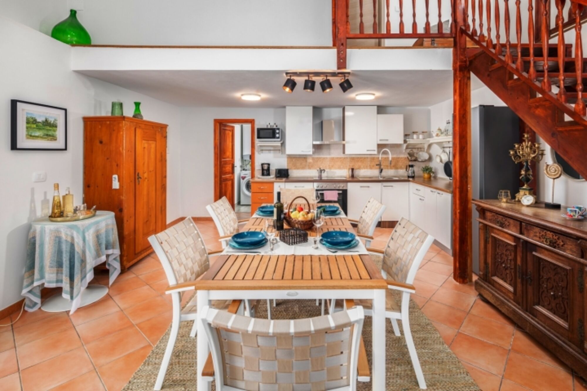 Tradition trifft hier auf Moderne, jeder Raum ist durch eine geschmackvolle Atmosphäre und moderner Technik gekennzeichnet. Im Erdgeschoss befindet sich ein Schlafzimmer mit Blick auf Garten und Pool, eine komplett ausgestattete Küche mit großem Ess-/ Wohnbereich, in dem alle Gäste der Villa Zeit zusammen verbringen können. Auf der ersten Etage, befindet sich ein weiteres Schlafzimmer mit angrenzendem Duschbad. Auch dort haben Sie einen herrlichen Blick auf den Poolbereich und die friedliche Umgebung.