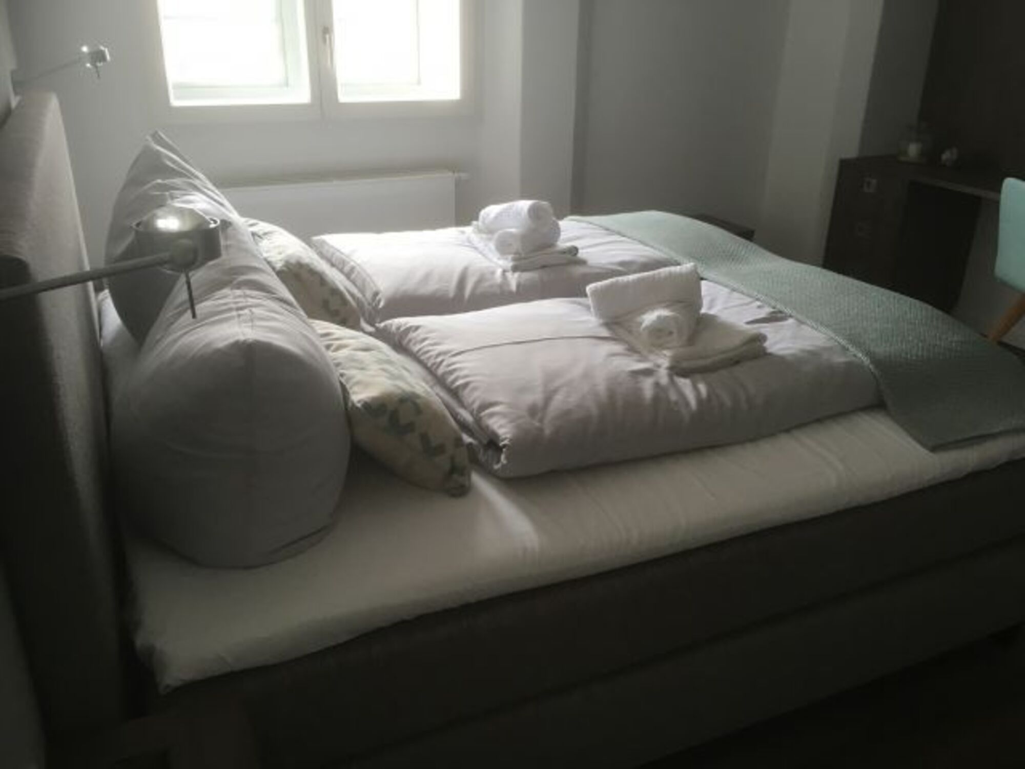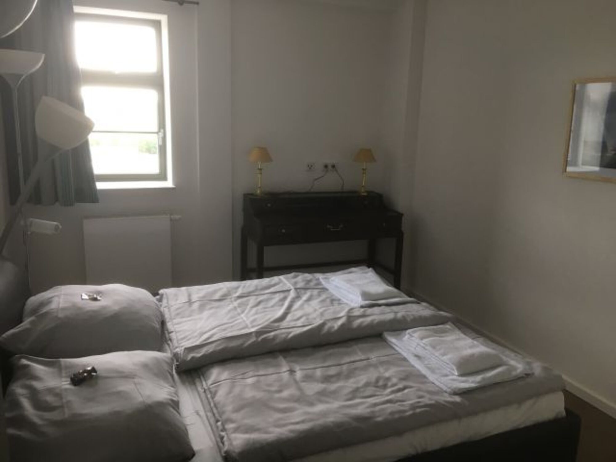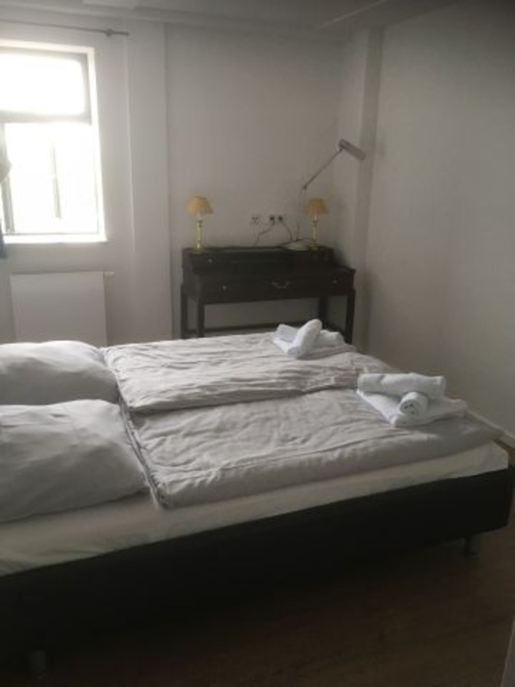 Komfortables Doppelbett, kleiner Sekretär im Schlafzimmer zum lesen oder schreiben. Doppelbett 1,80 x 2,00m