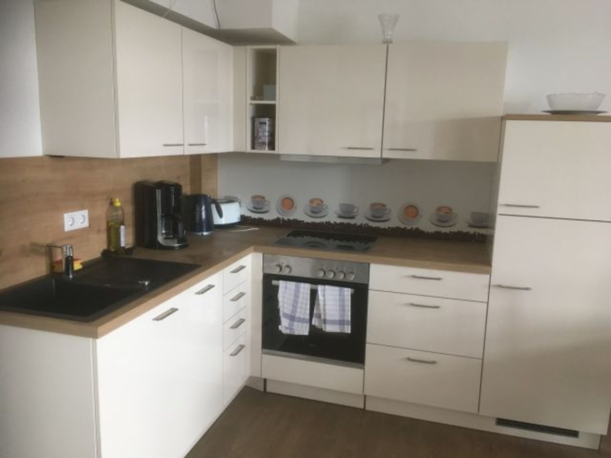 Induktionsherd, Dunstabzugshaube, Kühlschrank mit Gefrierfach, Korkenzieher / Flaschenöffner, Geschirrhandtücher, Mülltüten