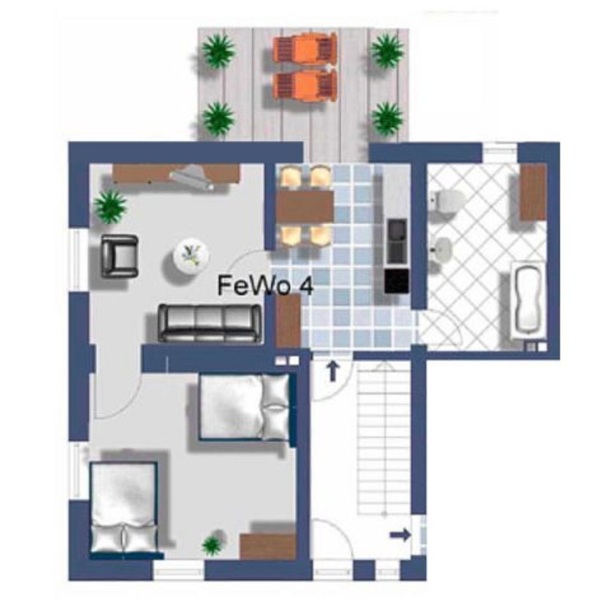 Unsere Ferienwohnung 4 verfügt über Wohnzimmer mit Schlafcouch, Schlafzimmer mit Doppelbett und ausziehbarem Doppelbett, Kinderreisebett auf Anfrage, Küche, Bad mit Dusche, TV / Radio und ist für 2-4 Personen geeignet.