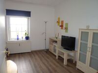 Wohnzimmer mit Schlafcouch, Schlafzimmer mit Doppelbett und ausziehbarem Doppelbett, Kinderreisebett auf Anfrage, Küche, Badewanne, TV / Radio, für 2-6 Personen