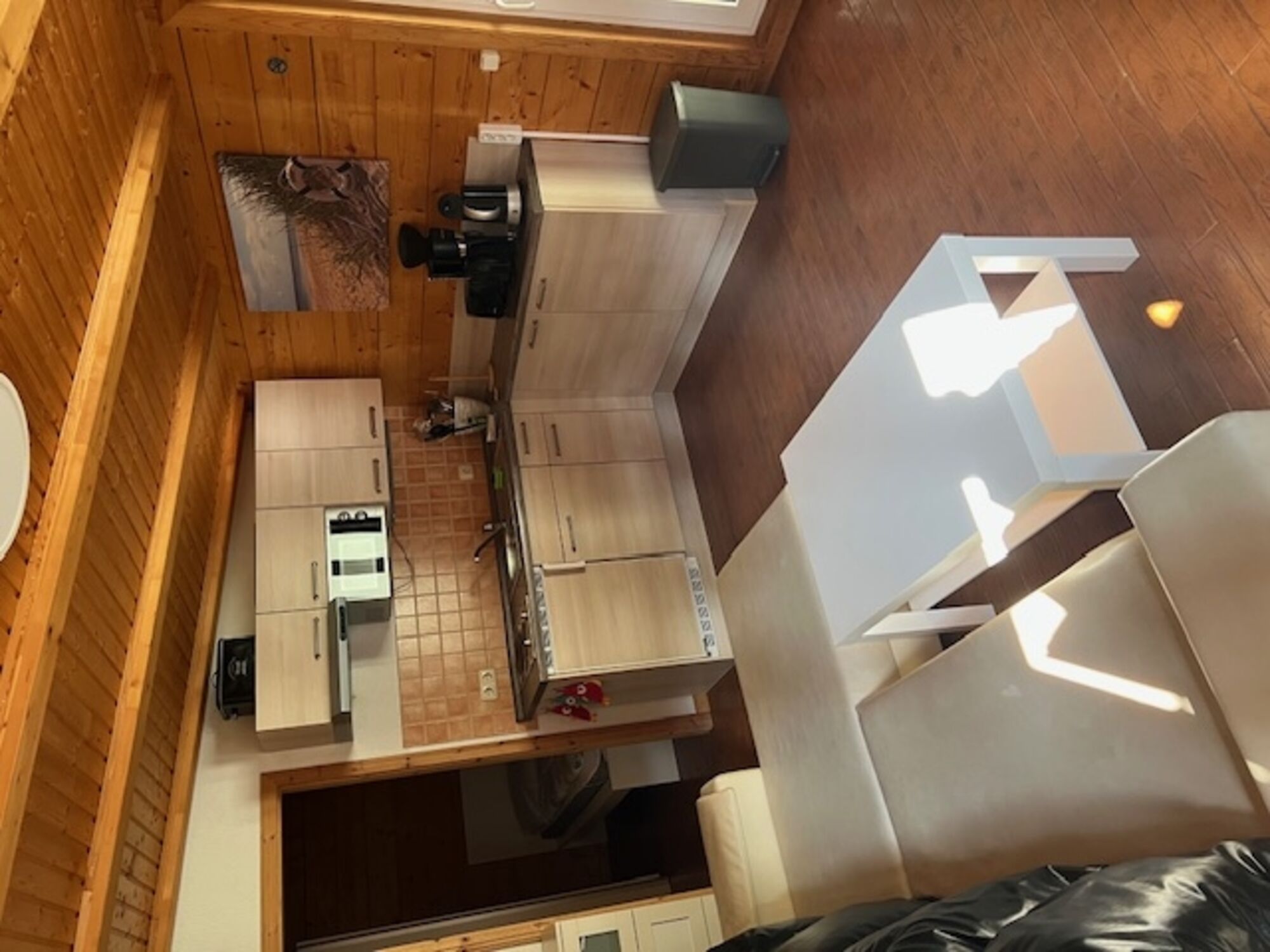 Ein Kühlschrank mit kleinem Tiefkühlfach hält Ihre Vorräte frisch. Der E-Herd mit Dunstabzugshaube bietet die Möglichkeit sich selbst zu versorgen.