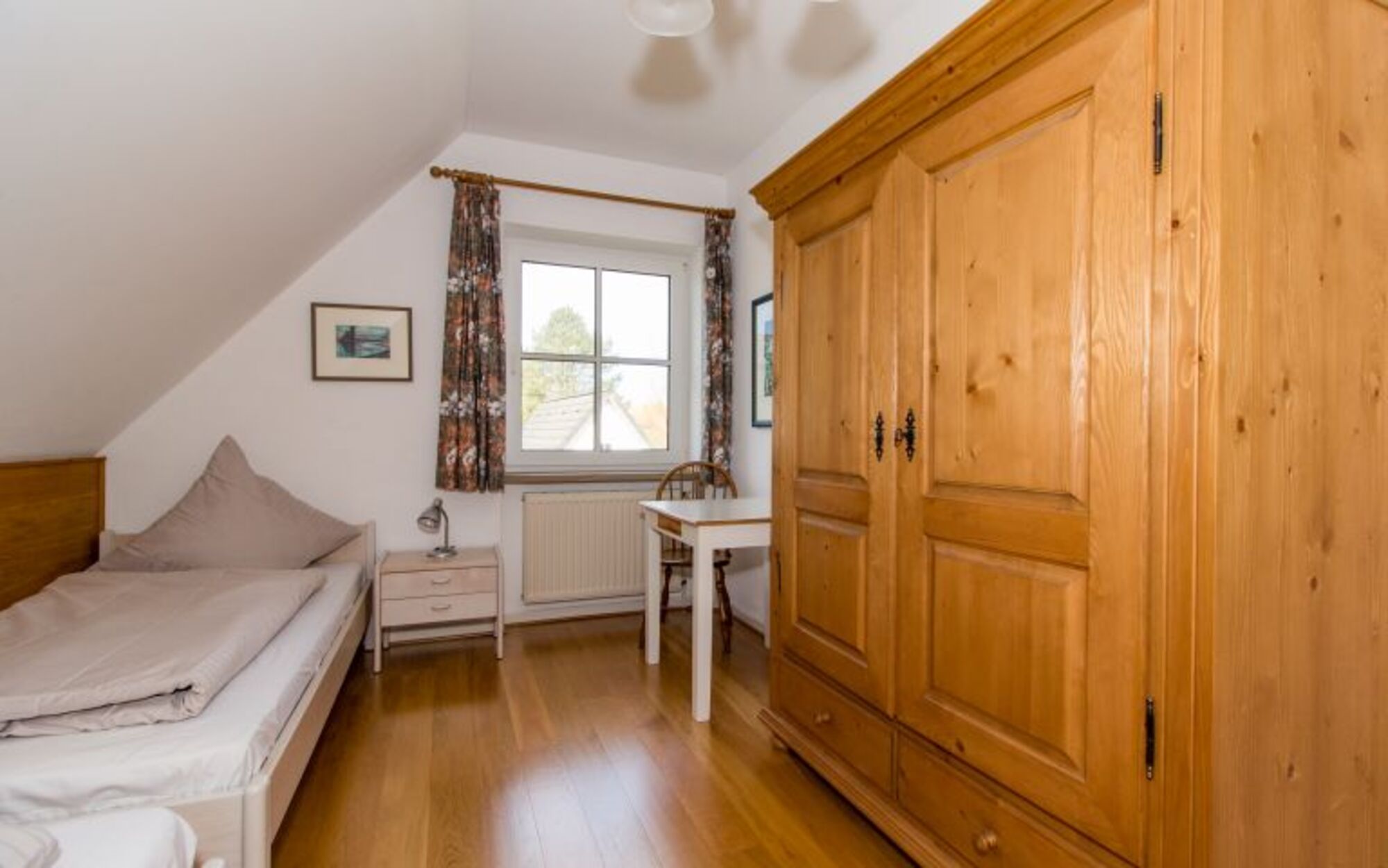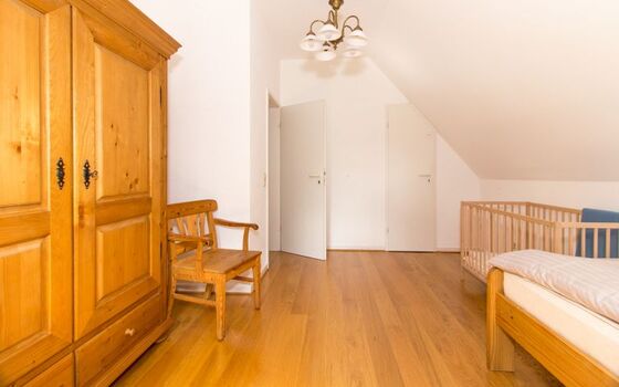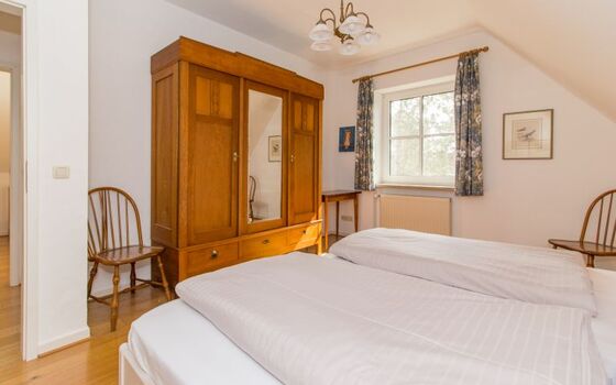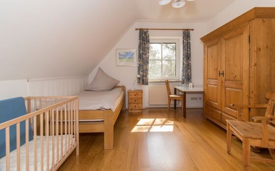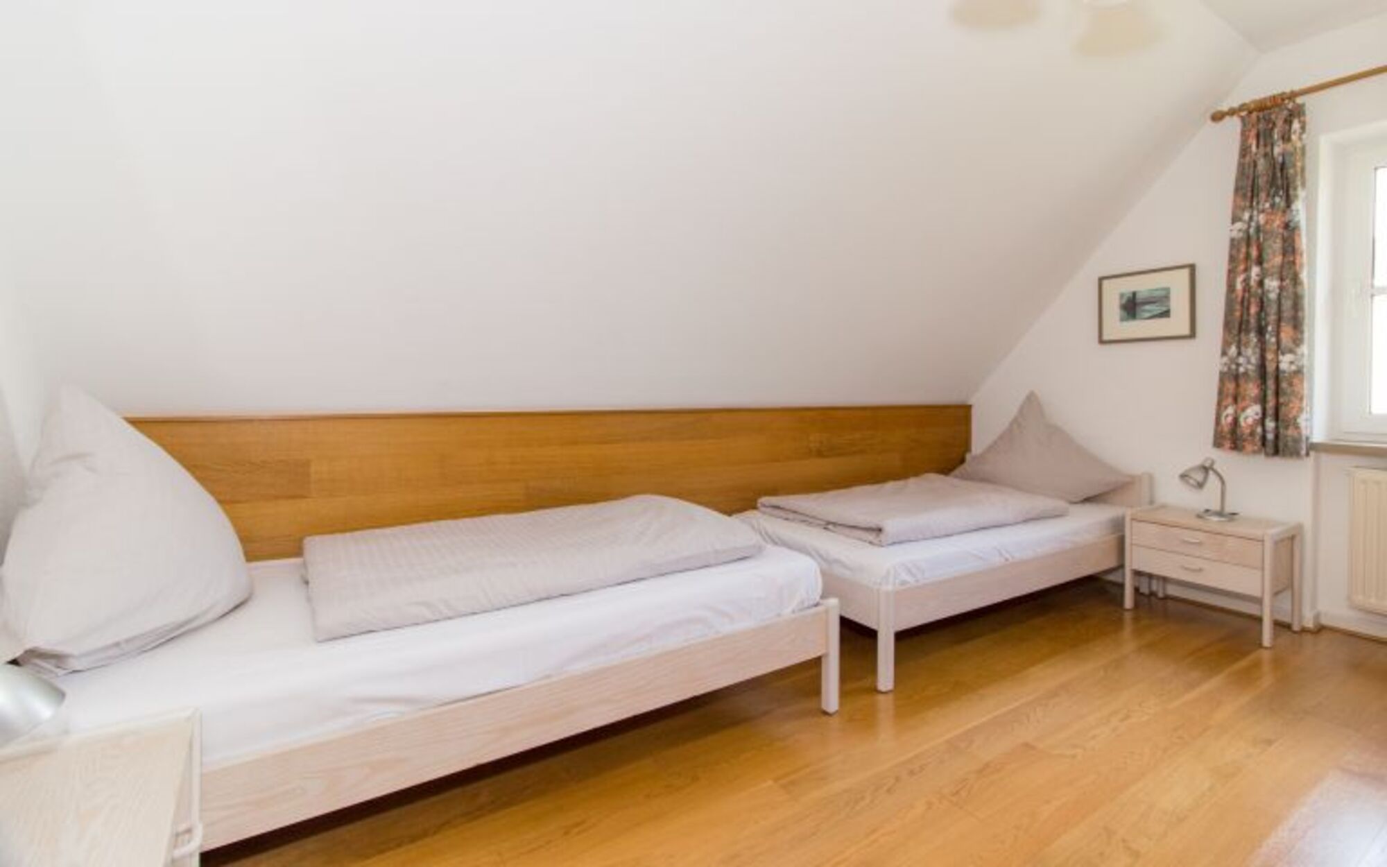 Im Obergeschoss befinden sich die drei Schlafzimmer. Eines mit Doppelbett und Kleiderschrank, das zweite mit Einzelbett und Kinderbettchen und das dritte mit zwei Einzelbetten. Hier oben steht auch ein Tageslicht-Bad mit Badewanne zur Verfügung. Frischluft-Rückzugsort ist der Garten mit Strandkorb und möblierter, überdachter Terrasse.