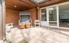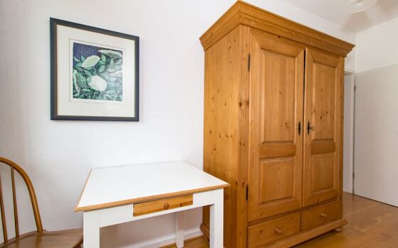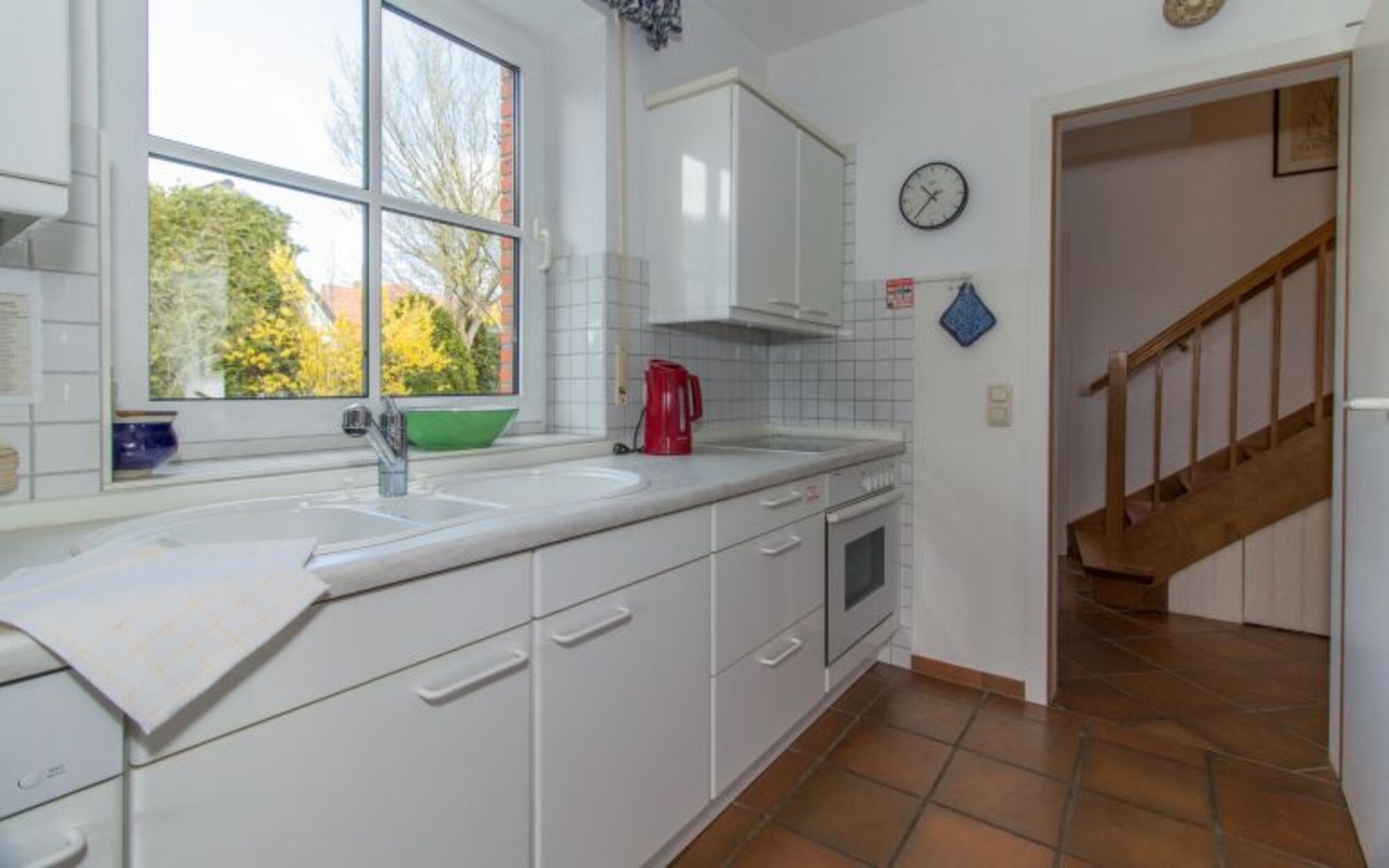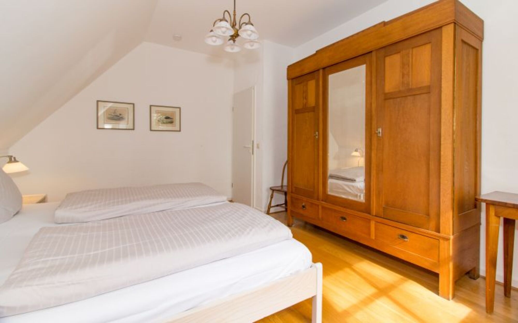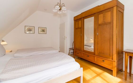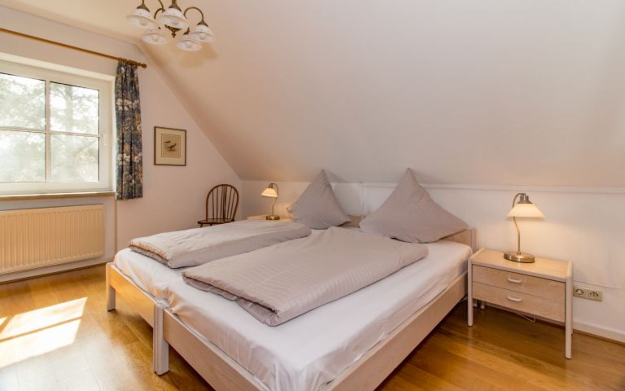 Im Obergeschoss befinden sich die drei Schlafzimmer. Eines mit Doppelbett und Kleiderschrank, das zweite mit Einzelbett und Kinderbettchen und das dritte mit zwei Einzelbetten. Hier oben steht auch ein Tageslicht-Bad mit Badewanne zur Verfügung. Frischluft-Rückzugsort ist der Garten mit Strandkorb und möblierter, überdachter Terrasse.