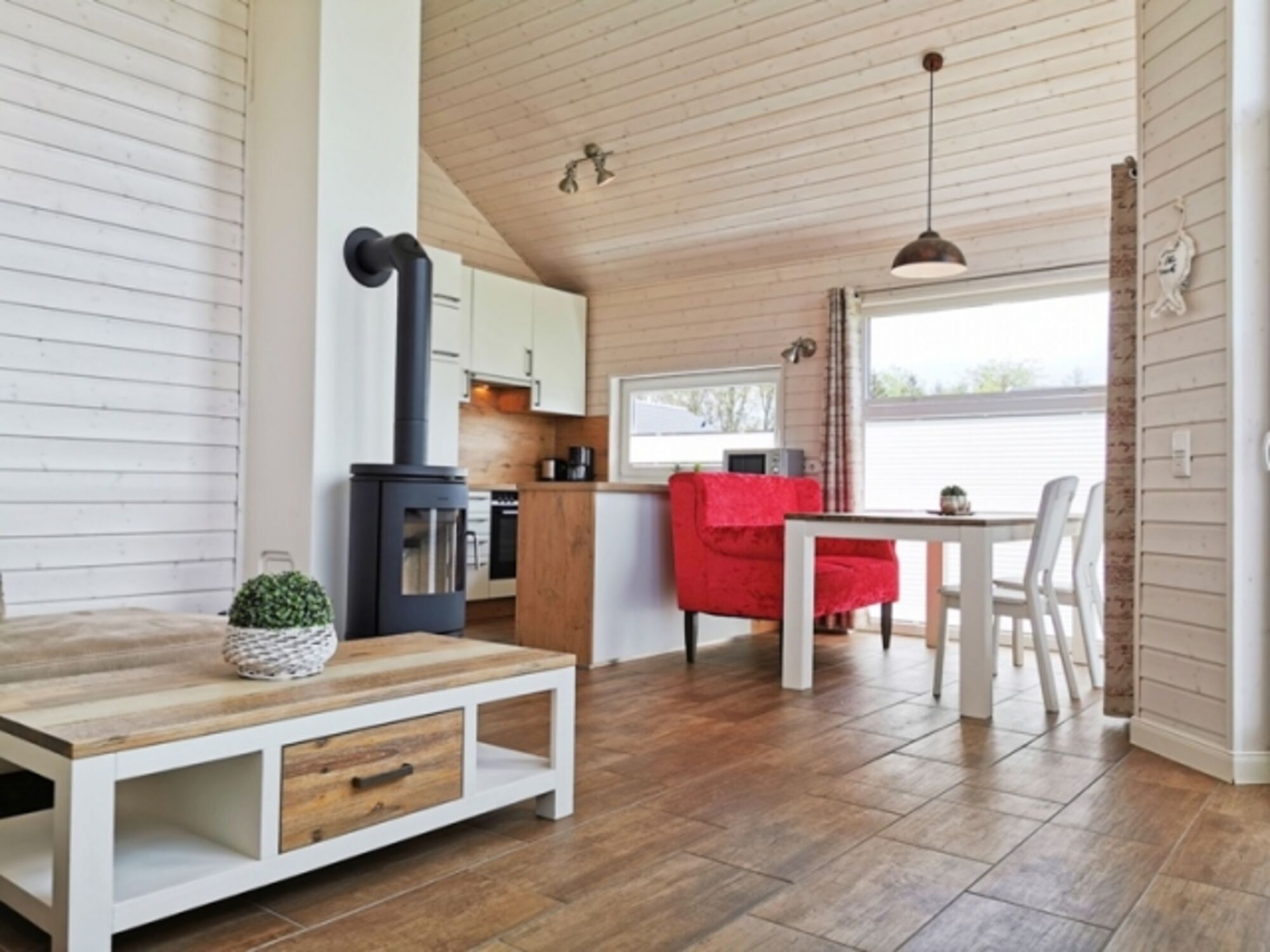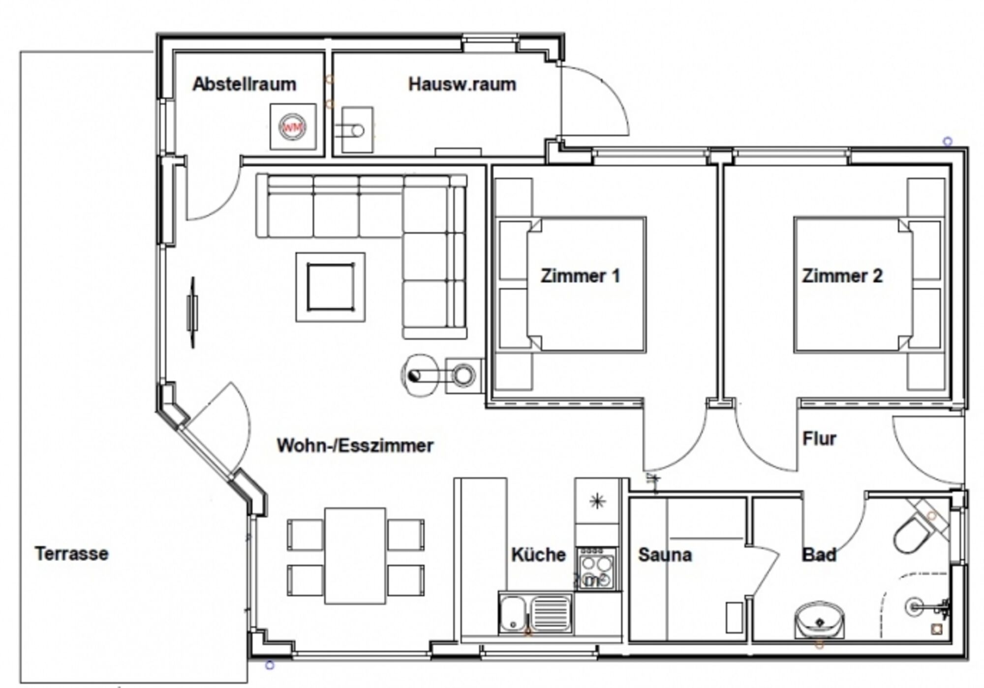 Innenausstattung: offene Küche, Wohn-/Essbereich, 2 Schlafzimmer, Duschbad, Sauna