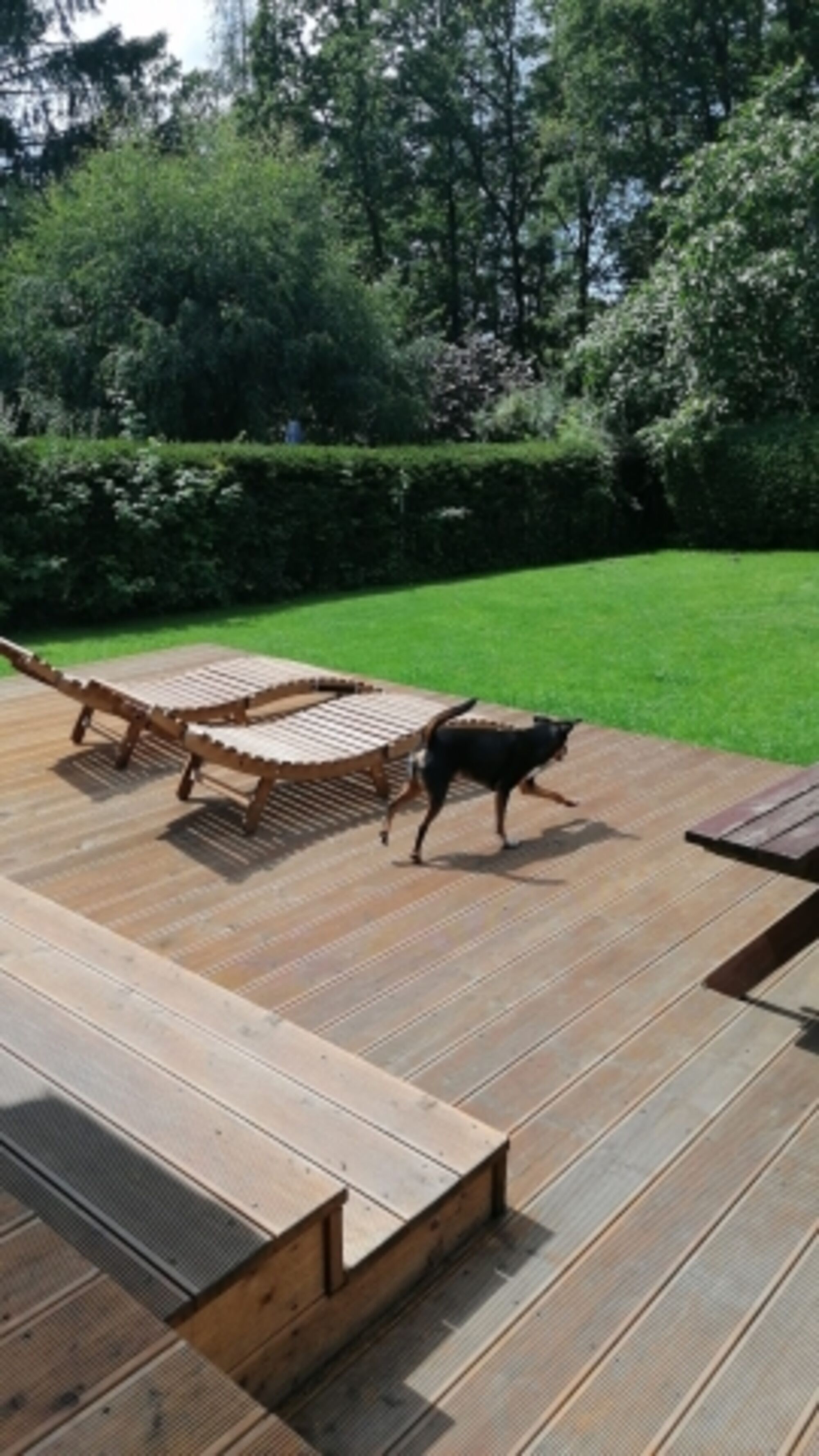 Genießen Sie im Sommer sonnige Stunden auf der Terrasse, während Ihre Hunde im Garten spielen oder Siesta im Schatten halten.