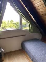 Eine der Dachneigung angepasste Raumspartreppe führt Sie vom Wohnraum zu den beiden Schlafzimmern. Im kleinen Schlafzimmer finden Sie ein Einzelbett mit Blick auf das umliegende Feriendorf. Das große Schlafzimmer verfügt über ein 1,80 m x 2 Meter Doppelbett und bietet einen herrlichen Ausblick in den Garten oder nachts in den Sternenhimmel.