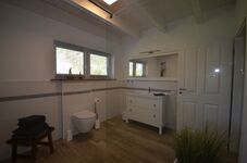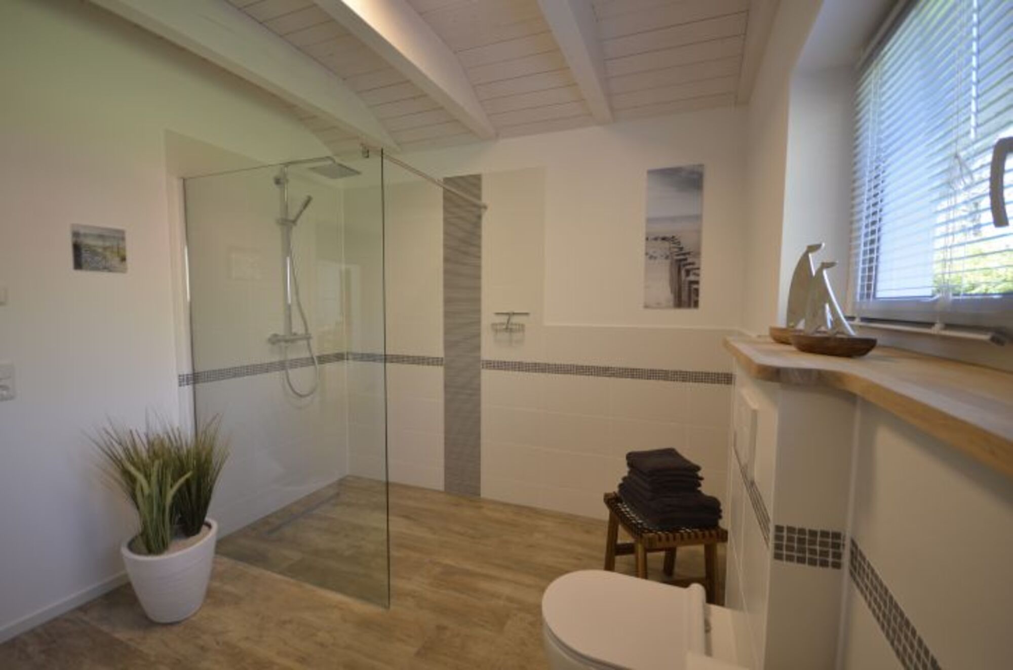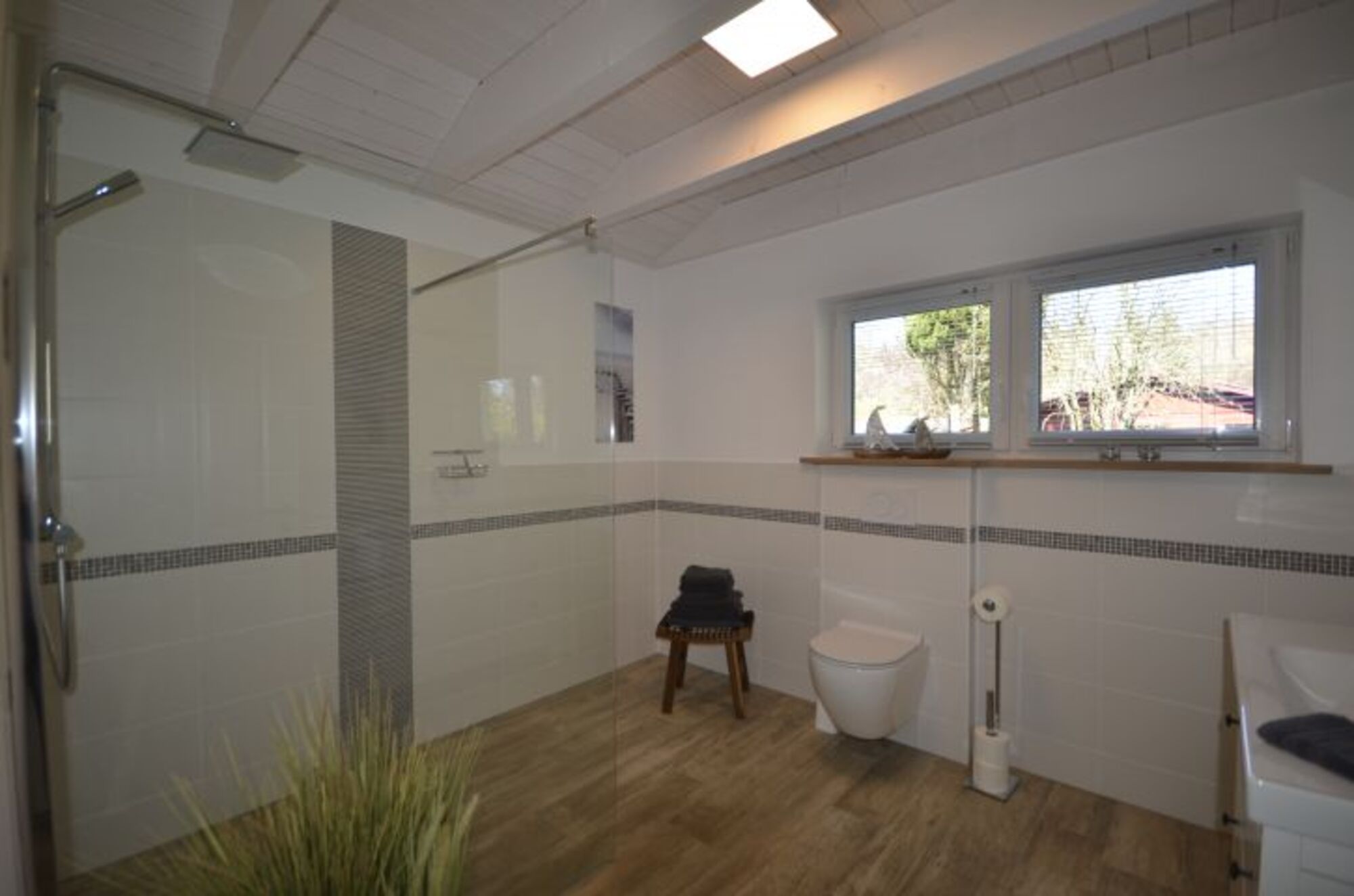 • einem geräumigen Bad mit komfortabler Dusche (ca. 1,20 m x 1,40 m) und WC, Fußbodenheizung und Handtuchtrockner. Ein Fön ist vorhanden.