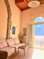 Das Wohnzimmer und das Schlafzimmer im ersten Stock grenzen an eine grosse Terazze mit traumhaften Blick ueber den See.