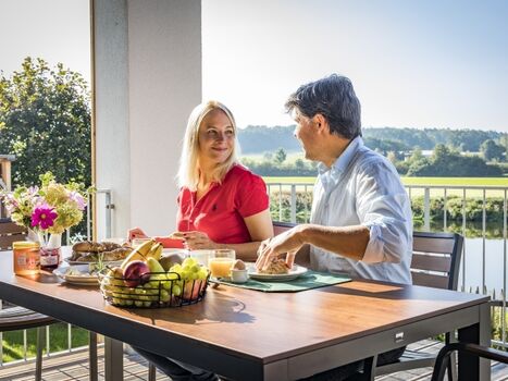 Genießen Sie von Ihrer eigenen überdachten Terrasse aus einen großartigen Blick über das Regental.