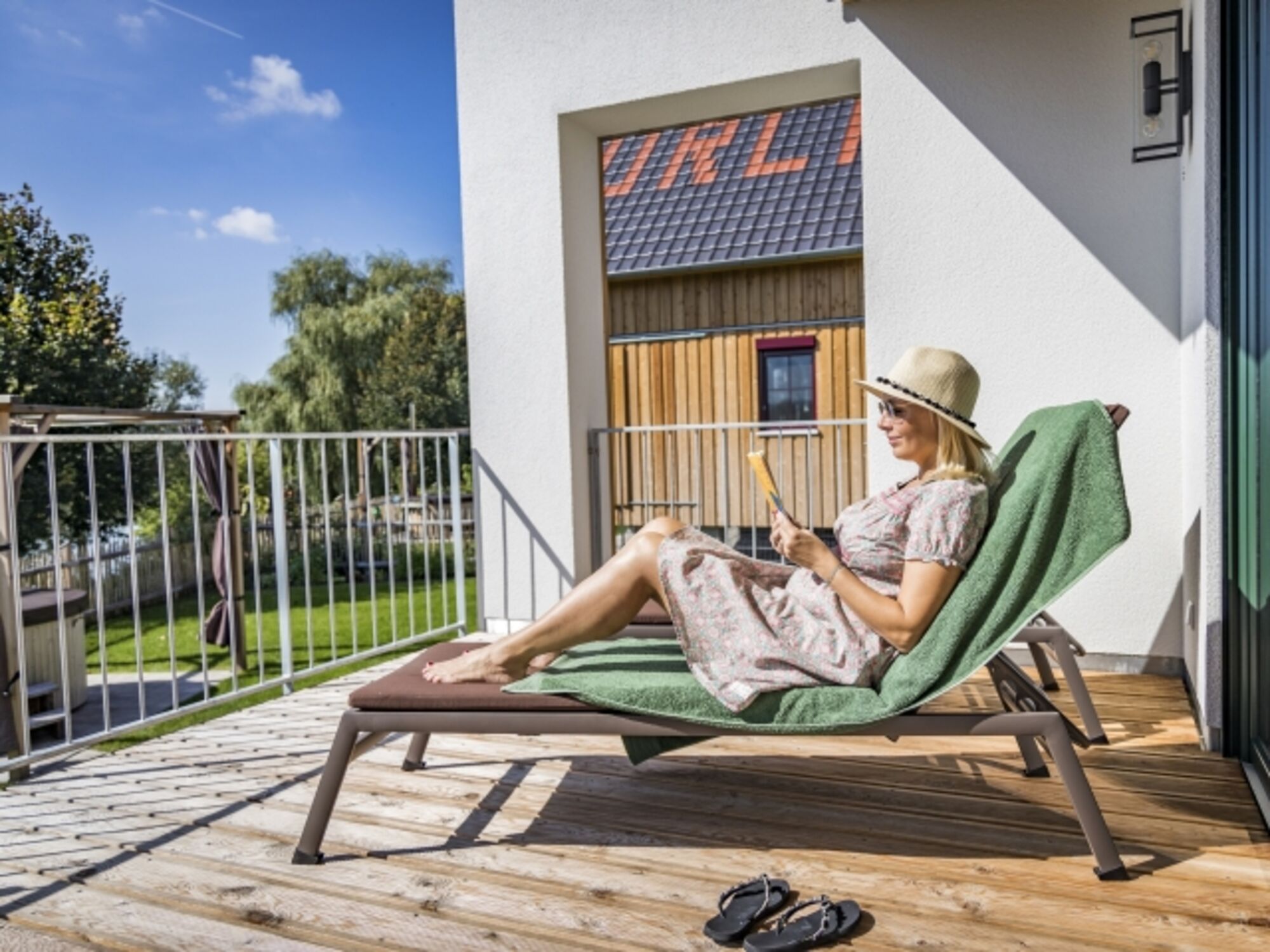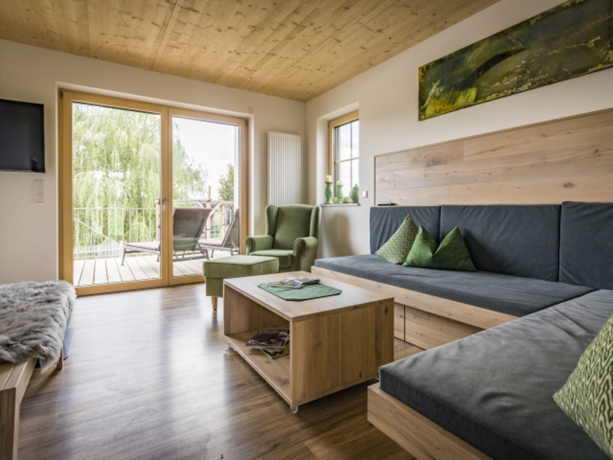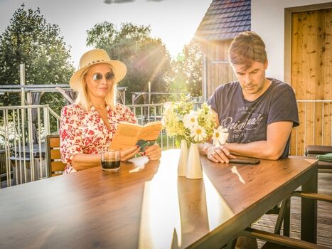 Genießen Sie von Ihrer eigenen überdachten Terrasse aus einen großartigen Blick über das Regental.