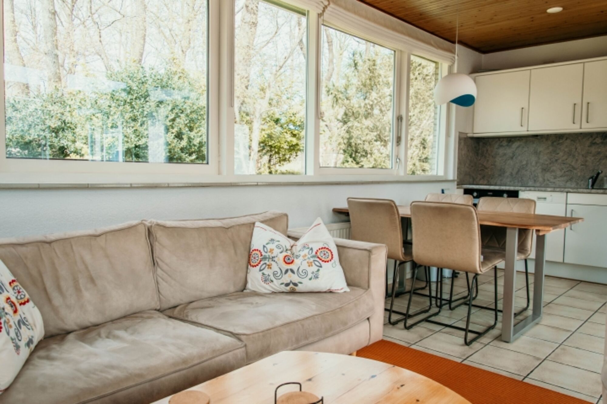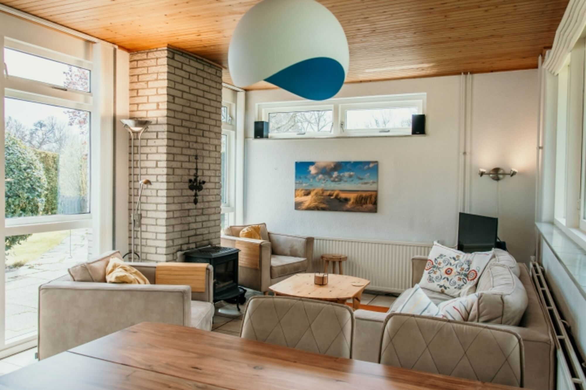 Die Wohnung wurde kürzlich völlig isoliert. Das stimmungsvolle Wohnzimmer mit neuen, anspruchsvollen Sitzmöbeln und einem schönen Holzofen ist mit Smart-tv Fernseher, DVD-Spieler und Radio mit CD-Spieler ausgestattet. Das Haus hat einen kostenlosen WLAN – Anschluß. Die großen Fenster bieten vom Wohnzimmer aus einen prächtigen Ausblick auf das anschließende Naturschutzgebiet.