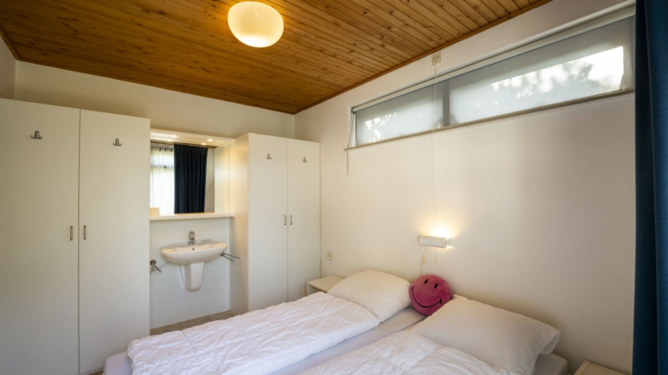 Es gibt 3 Schlafzimmer. Das große Elternschlafzimmer hat ein Bett von 160x200 cm und einen eigenen (zweiten) Waschtisch. Im zweiten Schlafzimmer befindet sich ein Etagenbett von 80x190 cm, das dritte Schlafzimmer hat ein Einzelbett mit geicher Abmessung. Alle Schlafzimmer haben direkten Zugang zur Terrasse.