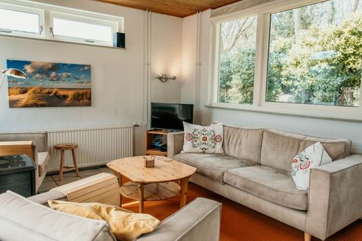 Die Terrasse und der Garten (Grundstücksgröße 730 m2) mit viel Sonne aber auch mit schattigen Stellen vermitteln das Gefühl von Freiheit. Der Garten hinter dem Haus grenzt direkt an die Zeepe Dünen, die Sie über einen Weg neben dem Haus bequem erreichen. Hinter dem Haus gibt es eine kleine, abschließbare Scheune für die Fahrräder.