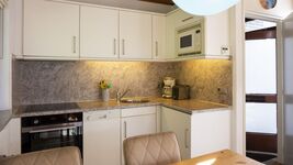 Die Küche ist mit einem qualitativ hochwertigen Ofen, einer Spülmaschine und einer Microwelle ausgerüstet und verfügt über ausreichende Kochgerätschaften und genug Tafelgeschirr.