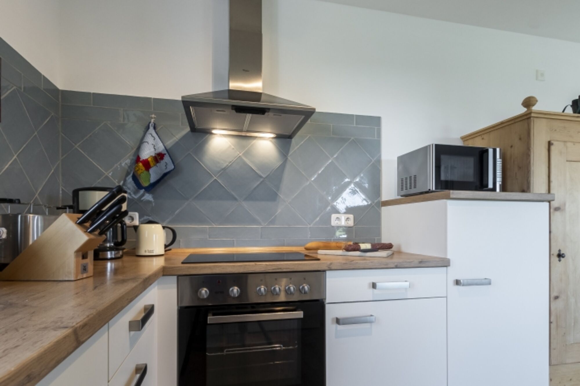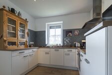 Cerankochfeld, Dunstabzugshaube, Kühlschrank mit Gefrierfach, Gefrierschrank, Eierkocher, Mixer, Korkenzieher / Flaschenöffner, Gewürze (Salz, Pfeffer, Zucker), Öl / Essig, Geschirrhandtücher, Mülltüten, Essplatz in der Küche, TV in der Küche