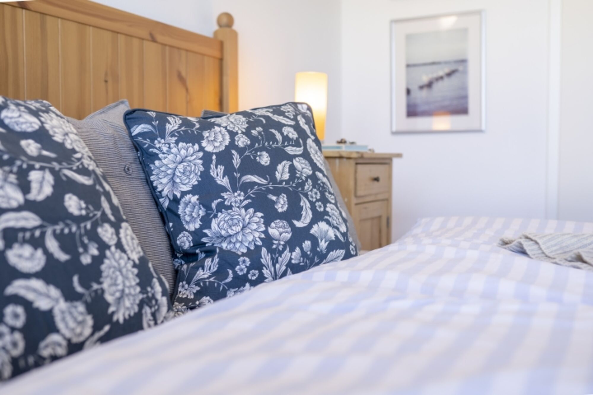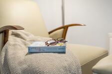 Direkter Meerblick Doppelbett mit zwei Matratzen; Maße jeweils 1,00 x 2,00m Leseecke mit Sessel, Leselampe und Büchertruhe Kinderreisebett mit fester Matratze (1,20 x 0,70m) Doppelbett 2,00 x 2,00m, Kommode, Leselampe am Bett